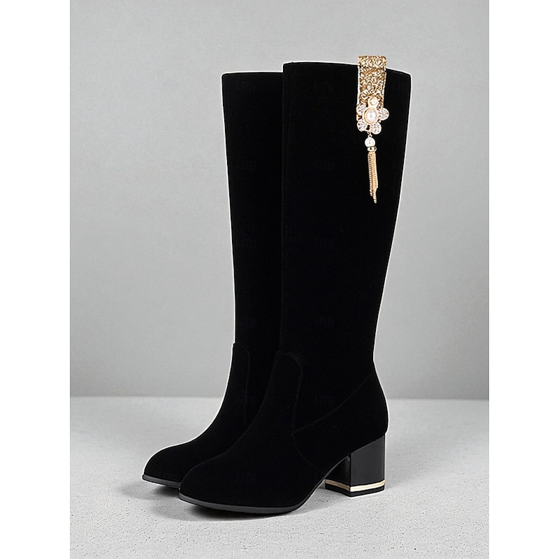 More information about Women's Red Knee-High Boots with Chunky Block Heel and Pearl Tassel Embellishment, Elegant Christmas Party & Holiday Fashion Boots for Winter Outfits