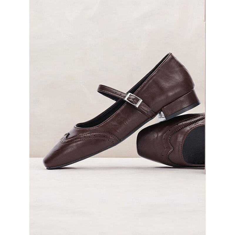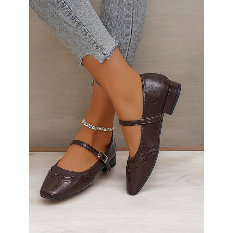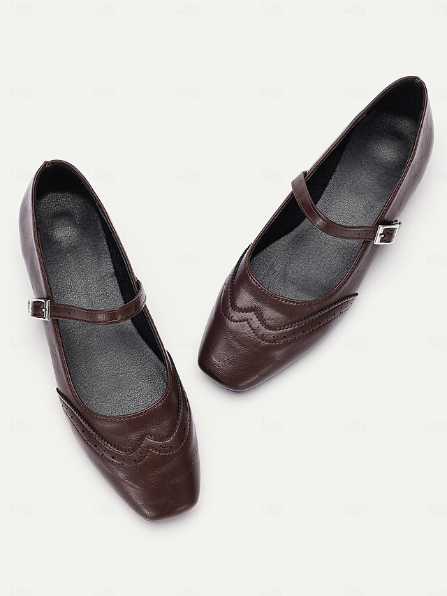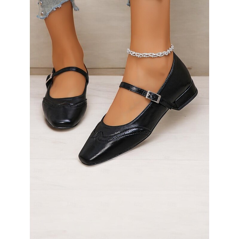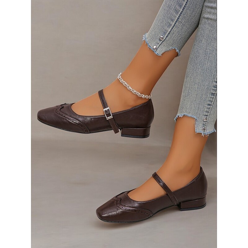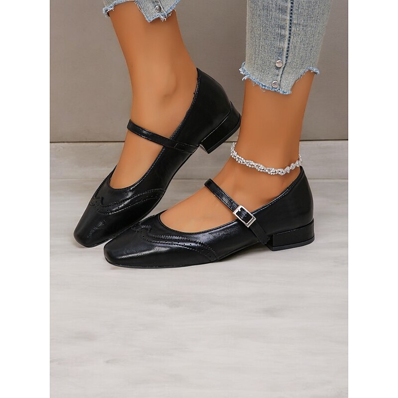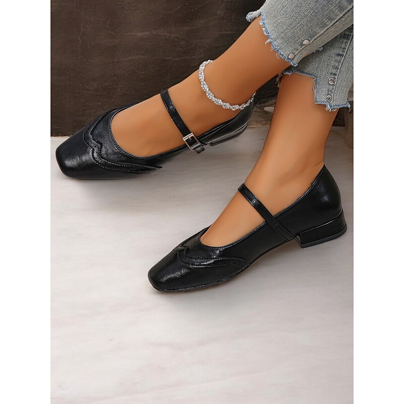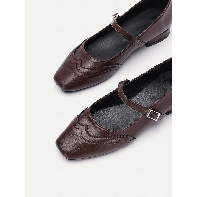 Highlights [Fabric] Crafted from high-quality PU, these Women's Mary Jane Flats offer a soft yet durable faux leather finish. The synthetic leather lining ensures breathability and comfort, making them suitable for extended wear throughout the day. [Style & Fit] With a enduring square toe design, these flats deliver a new-age yet timeless look. The low heel provides just the right amount of lift for comfort and style, while the cushioned insoles offer support for all-day wear. [Design Highlights] Featuring decorative brogue detailing, these flats exude elegance and sophistication. The adjustable strap with a metal buckle not only ensures a secure fit but also enhances their vintage aesthetic. These intricate details add a touch of charm to any outfit. [Usage Occasions] Perfect for daily wear and work settings, these flats seamlessly blend fashion and practicality. Ideal for both casual and semi-formal occasions, they are a versatile addition to your wardrobe, suitable for spring, summer, and fall. [Size Notice] Available in a range of sizes from US5.5 to US10.5, these shoes are designed to fit true to size. Select your usual size for optimal comfort and a perfect fit.