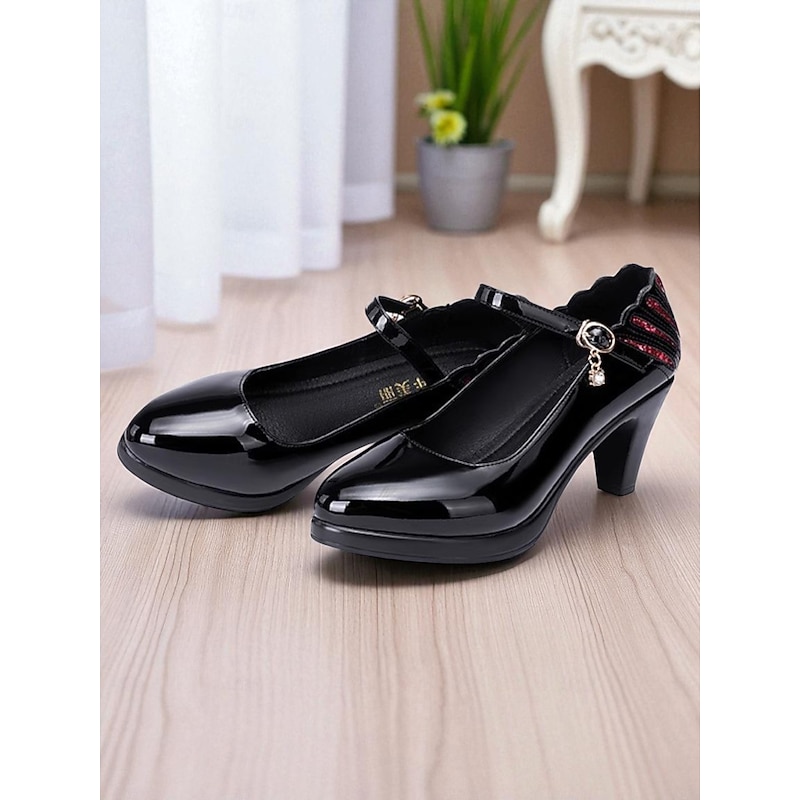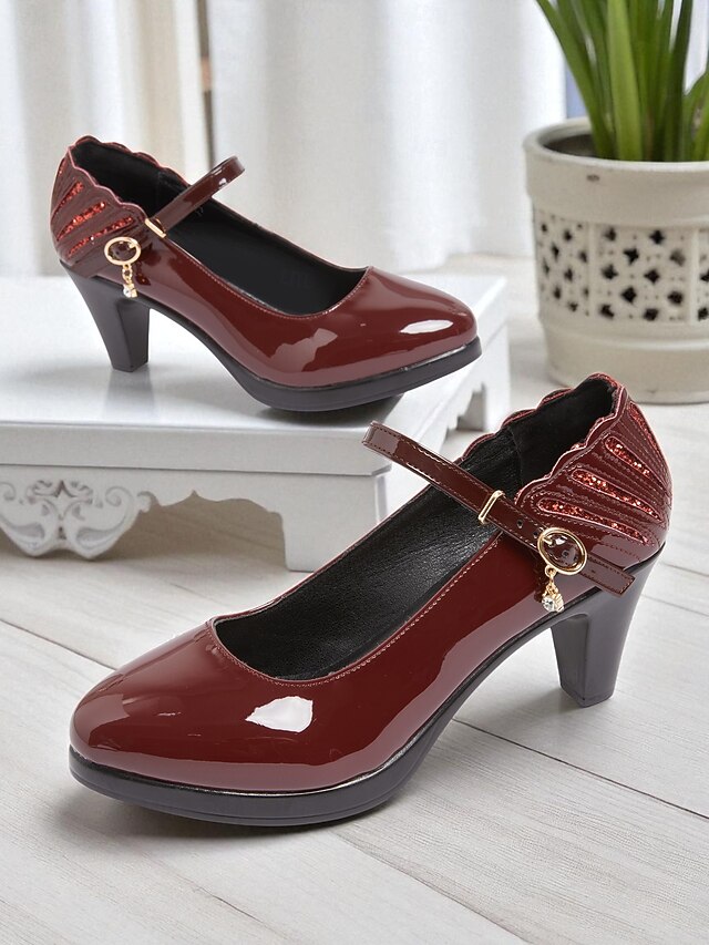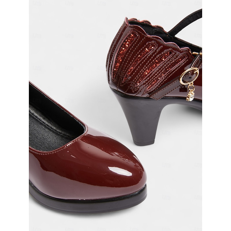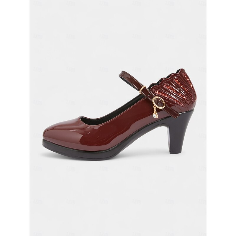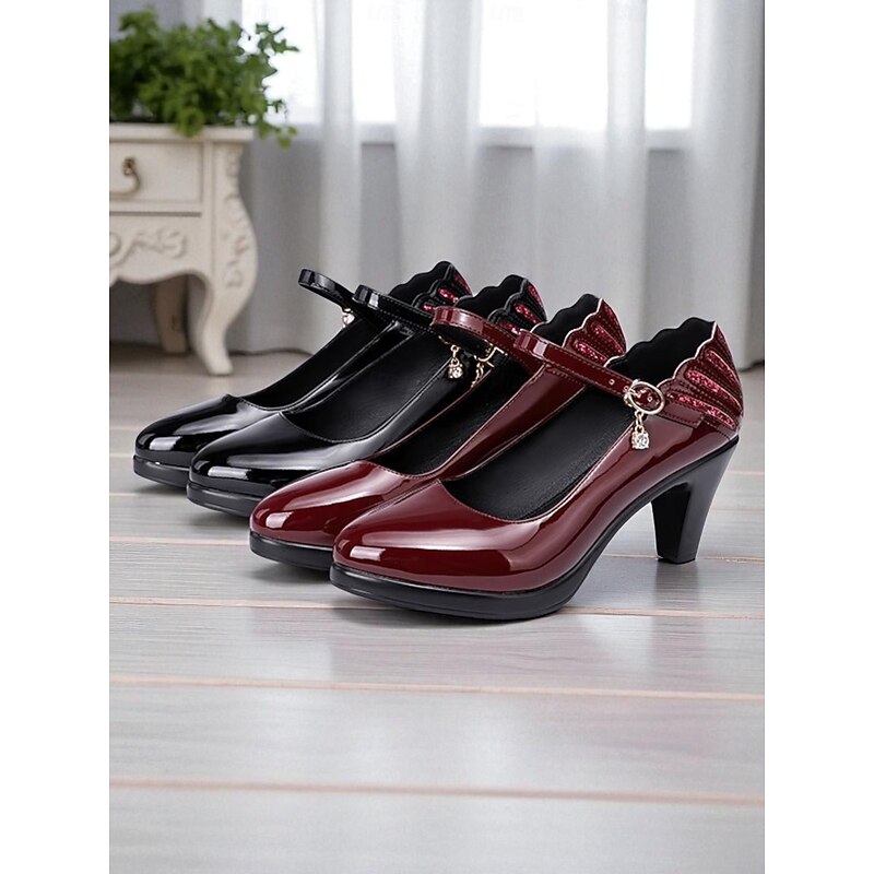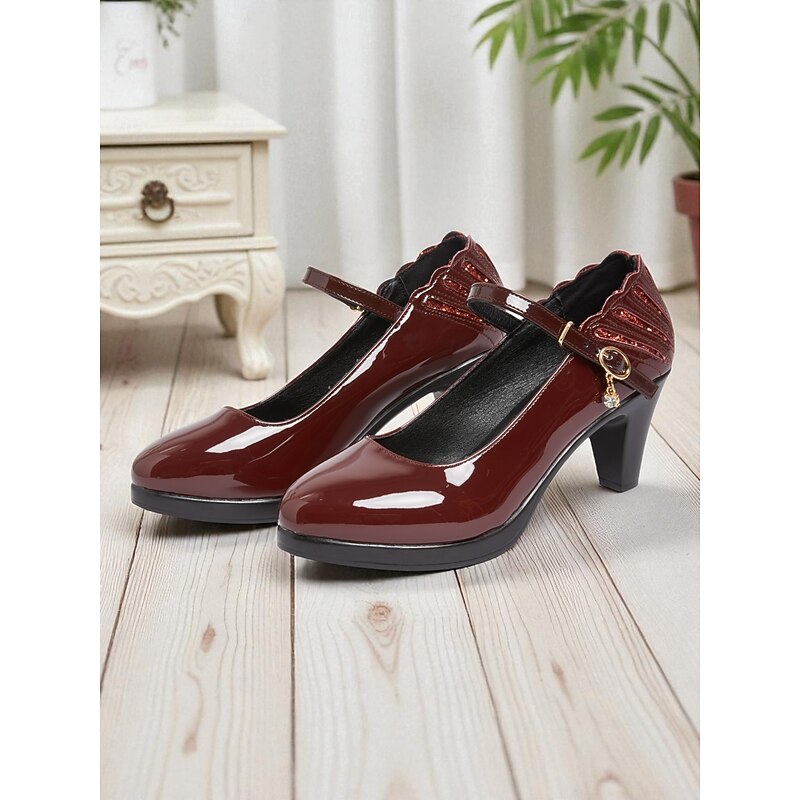 trending ! Women's Burgundy Patent Faux Leather Mary Jane Heels with Ankle Strap – vintage Comfort Pumps for Church Events, Banquets and Middle-Aged Ladies' Gatherings