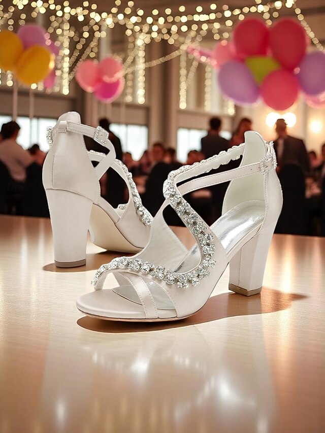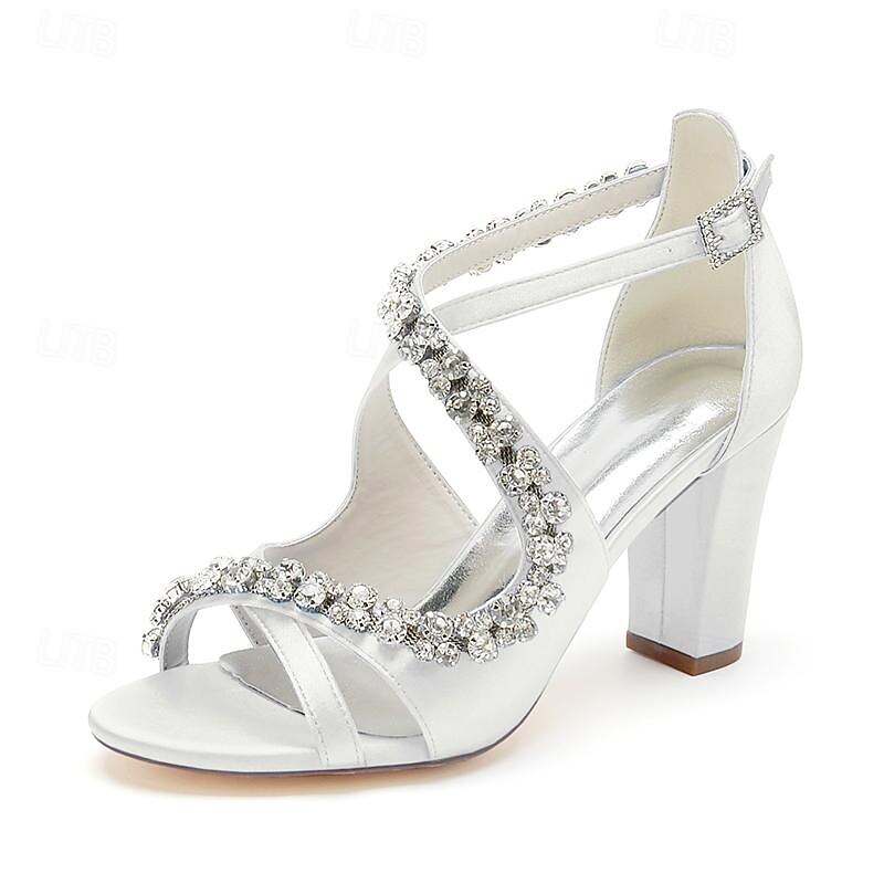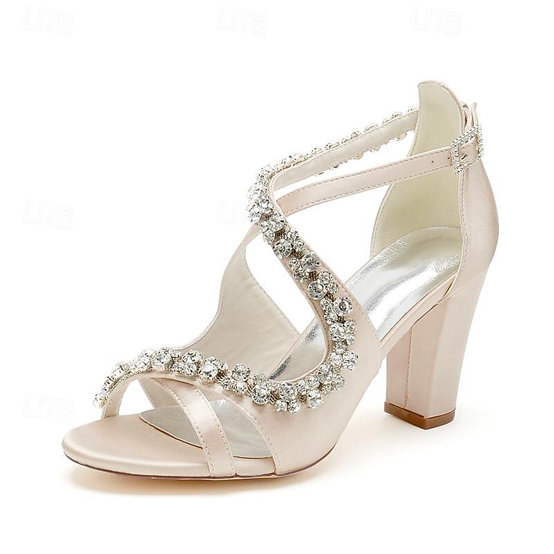 Women's Ivory Satin Chunky Heel Sandals with Rhinestone Straps – Elegant Open-Toe Dress Shoes for Cocktail Parties and Weddings