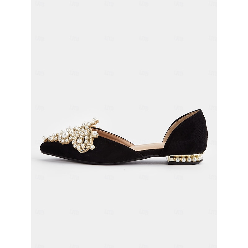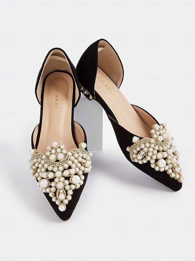 trending ! Black Satin Pointed Toe Flats for Women with Pearl & Crystal Embellishment – Elegant Bridal Flats for Weddings and Special Events