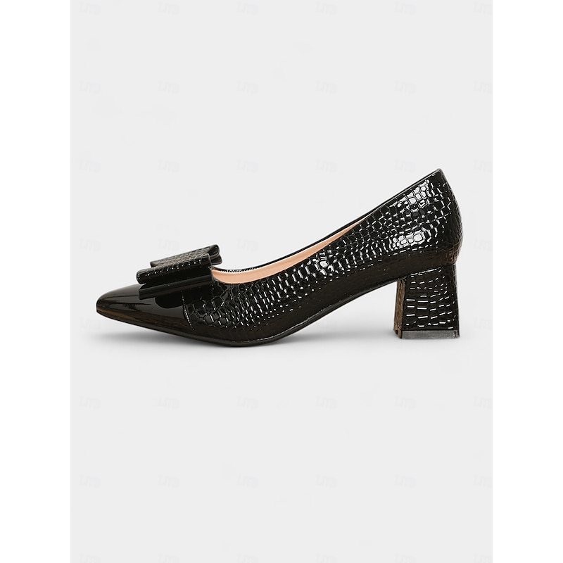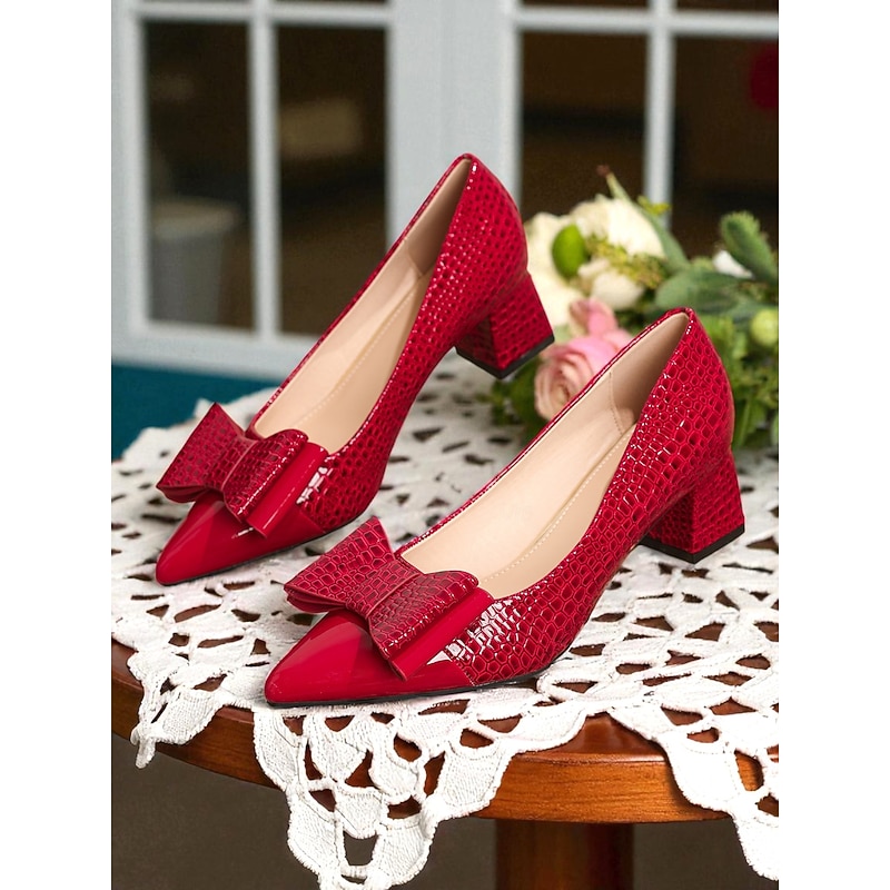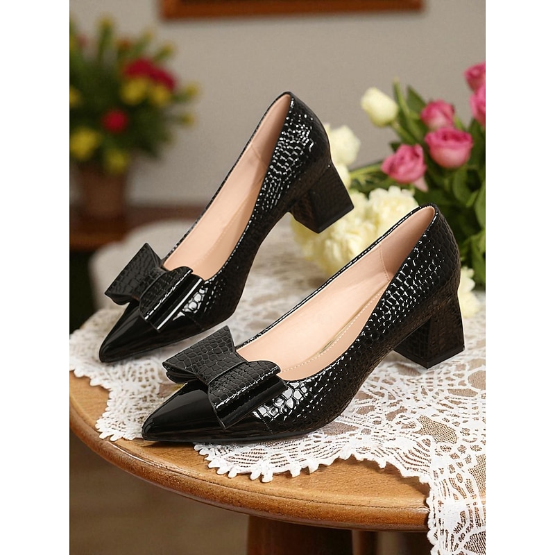 Why Choose Women's Vintage Croc Embossed Patent Leather Heels - Brown Pointed Toe Pumps with Oversized Bow and Block Heel for Office,Tea Parties,and 1950s-Inspired Outfits?