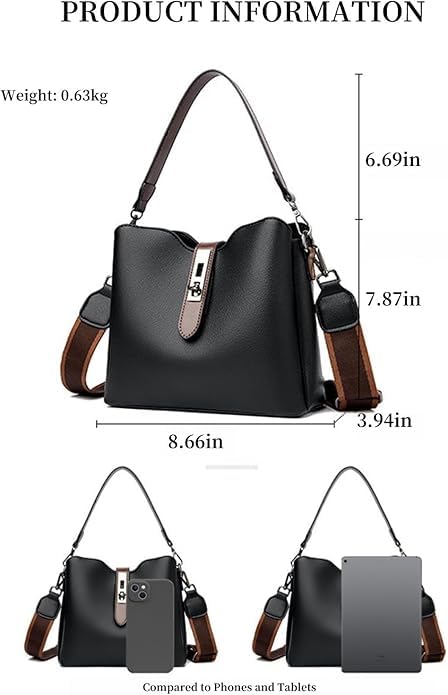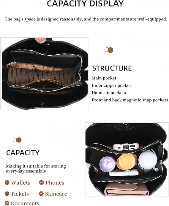 Three Straps Bucket Bag for Women, Large capacity, Zipper Compartments, Adjustable Wider Shoulder Strap