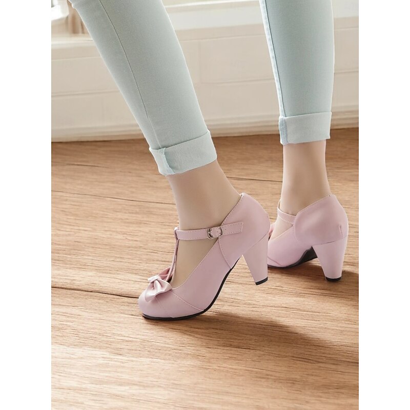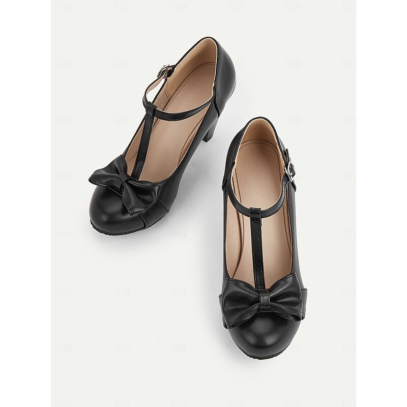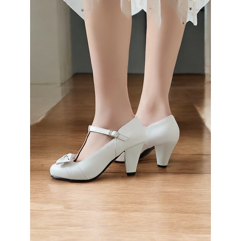 : The elegant T-strap design is complemented by a charming petite bow at the front, adding a touch of femininity and sophistication. The adjustable buckle closure allows for a secure fit, enhancing the overall retro-inspired aesthetic.