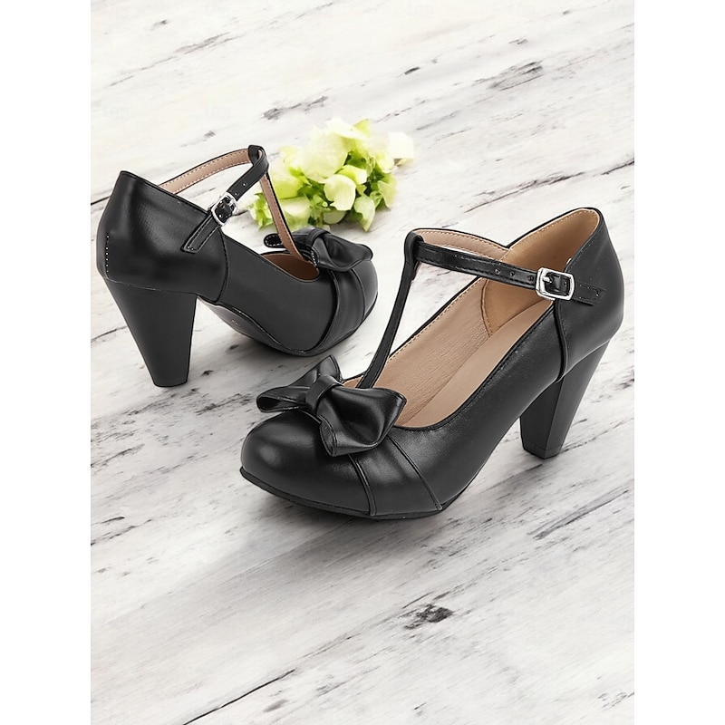 More information about Women's Black T-Strap Heels with Bow Detail - Vintage-Inspired Chunky Pumps for Office, Parties, or Formal Occasions