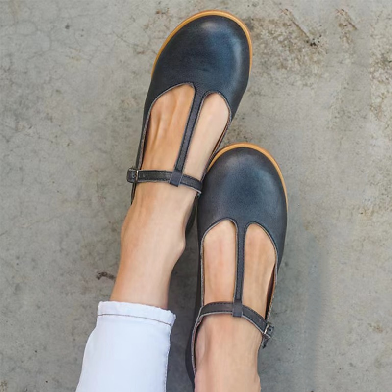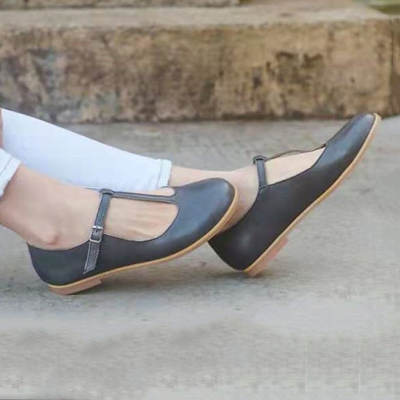 trending ! Women's Red Leather T-Strap Flats with Buckle Closure - Vintage-Inspired Casual Shoes