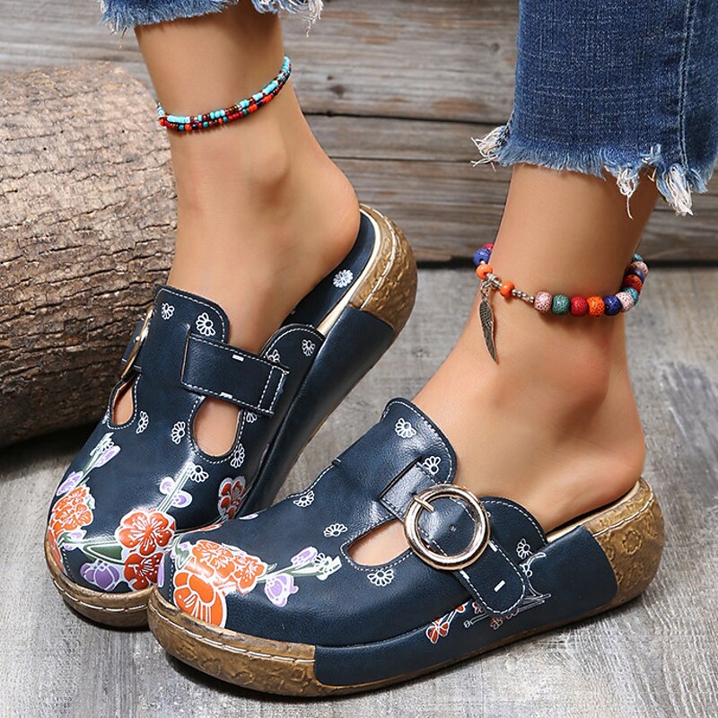 Women's Floral Embroidered Slip-On Clogs with Buckle Detail and Wedge Heel - relaxing Vintage Casual Shoes