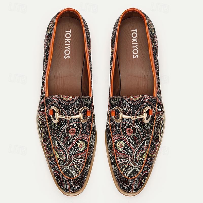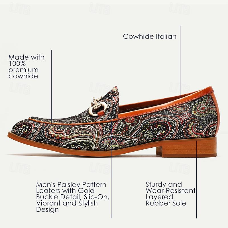 Highlights [Fabric] : Crafted from premium Italian full-grain cowhide leather, these men's loafers promise durability and a luxurious texture. The high-quality leather ensures a comfortable fit, enhanced by the soft cowhide lining. [Fit] : Designed in a classic loafer style, these shoes offer a snug fit with their slip-on design, making them both convenient and easy to wear. The rubber outsole adds slip resistance for secure wear in various settings. [Design Highlights] : These loafers showcase a vibrant paisley pattern in red, green, and gold for a sophisticated and elegant look. The decorative metallic element across the vamp adds a contemporary accent to the traditional silhouette, while the pointed toe shape gives a sleek and polished appearance. [Occasions] : Perfect for formal events and dressy occasions, these loafers also elevate smart-casual ensembles with their elegant design. Whether attending a business meeting or a festive celebration, these shoes offer style and versatility. [Size Range] : Available in a variety of sizes, from US8 to US13, these loafers cater to different foot sizes, ensuring a perfect fit for most men. Perfect for everyday use. first-class materials and excellent craftsmanship ensure long-lasting durability.