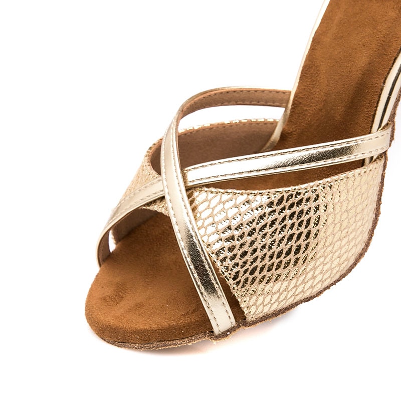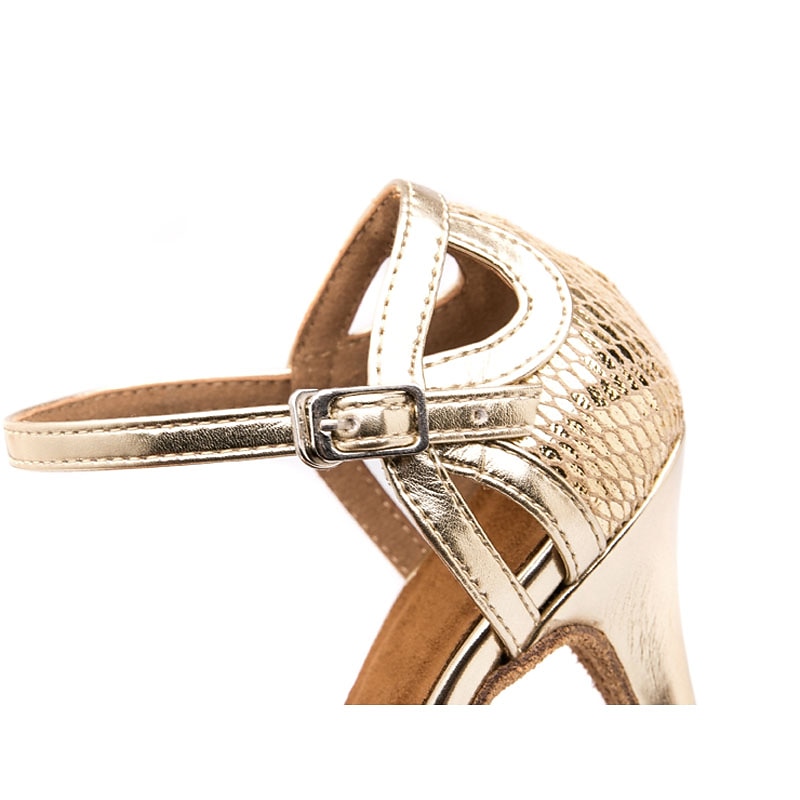 Highlights [Fabric] : Crafted from high-quality PU leather, these women's Latin dance shoes boast a luxurious and durable construction. The flannel lining enhances comfort and provides a soft feel against the skin, ideal for prolonged wear during performances. [Fit] : Designed with a sleek and slim high heel, these shoes feature a sophisticated open-toe style, offering elegance and charm. The ankle strap with a buckle closure ensures a secure and adjustable fit, catering to both style and functionality on the dance floor. [Design Highlights] : The shoes' metallic gold finish introduces a sparkling aesthetic, while the snakeskin-like textured pattern adds a rare touch of glamour. This combination of materials creates a standout look that is both fashionable and versatile, suitable for any dance event or formal occasion. [Occasions] : Perfect for Latin, ballroom, salsa, and line dancing, these shoes are a fantastic choice for indoor performances and ballroom dance settings. Their fashionable design ensures they are well-suited for both casual and formal dance events, adding sophistication to any ensemble. [Size Notice] : Available in a range of sizes, these dance shoes cater to various foot measurements. It is recommended to select one size larger than usual for the perfect fit.