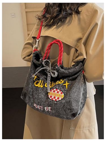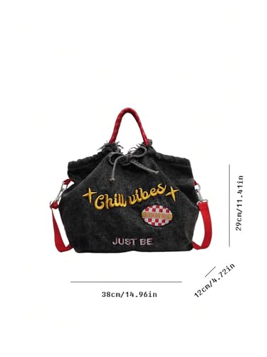 • Y2K Purse, Fashion Motorcycle Bag, Crossbody Bags for Women, Vintage Tote Bag, Letter Print, Double Handle, Large Capacity, Raw Trim, Contrast Color