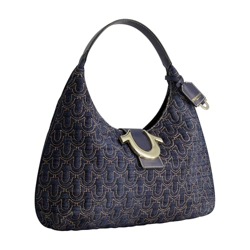 trending ! True Religion Quilted Denim Hobo Hand Bag, Large Horseshoe Stitch Shoulder Purse with Gold Hardware, Dark Denim
