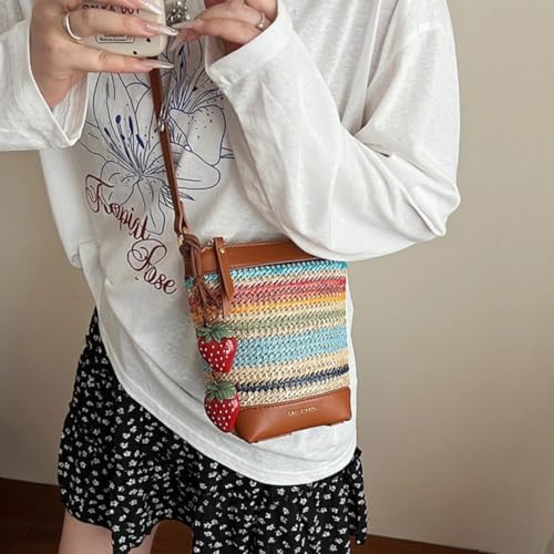 ORBENTO Rainbow Braided Straw Beach Bag for Women Lightweight Summer Shoulder Tote Resort Bucket Purse