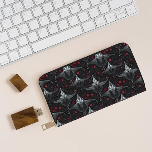 Gothic Style Manta Ray Print Wallet Women Men, Long PU Leather Wallets for Women, Cute Womens Travel Wallet Purse Pouch with Zipper Pocket