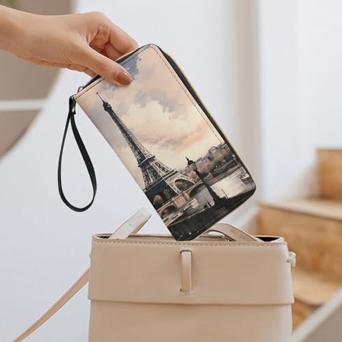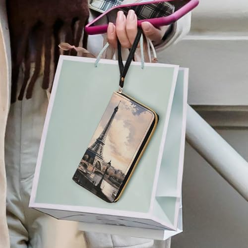 Vintage Style Eiffel Tower Paris Leather Wallet Smooth Zip Around Clutch Wristlet Travel Long supple Purse for Women