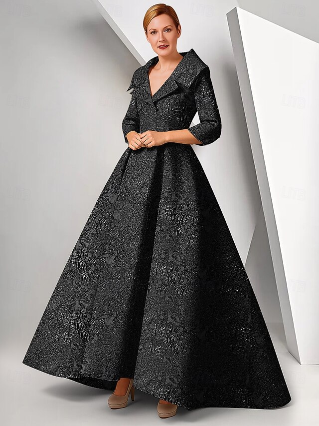 trending ! Black Floral Jacquard A-Line Evening Gown Elegant Dress Formal Wedding Floor Length Sleeveless V Neck Nylon with Pleats
