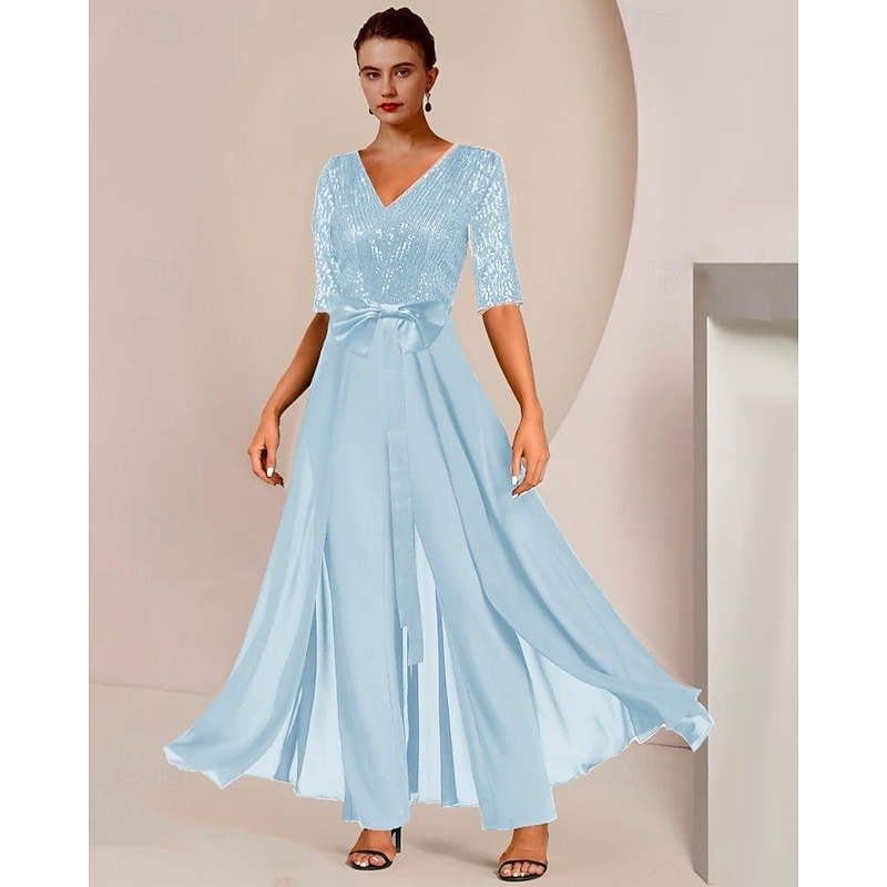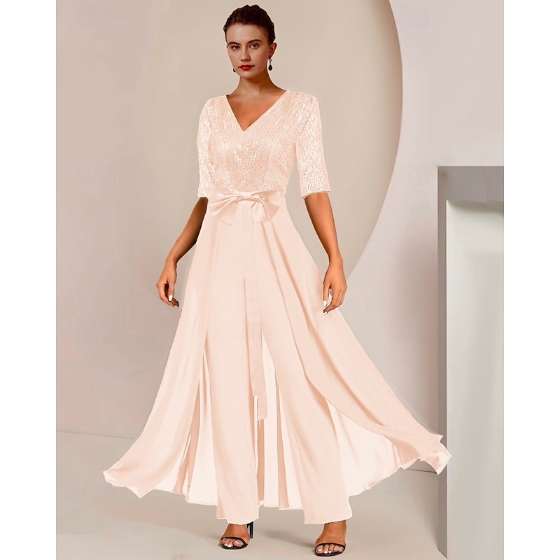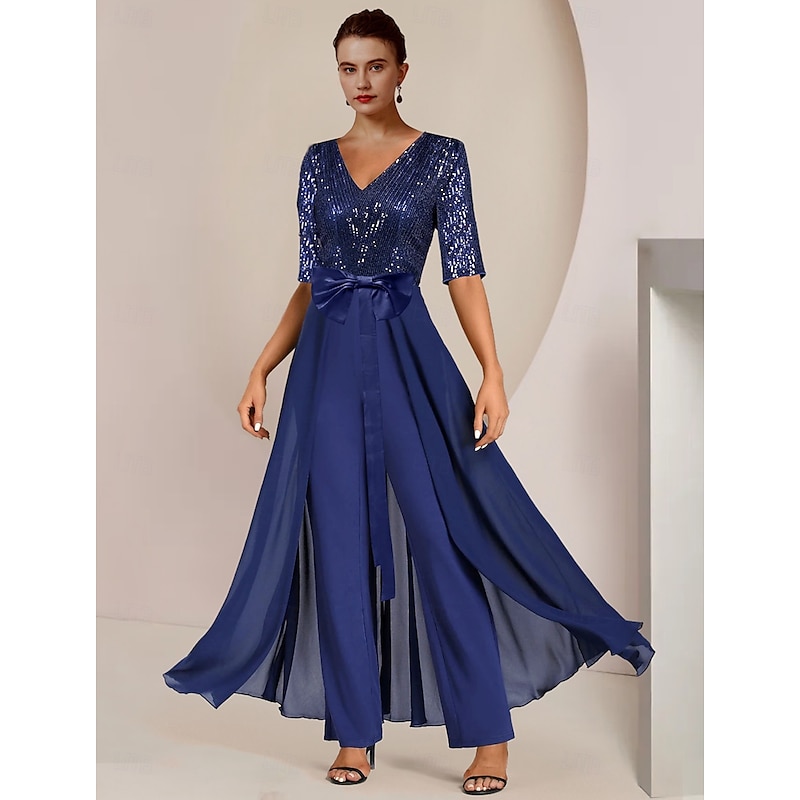 More information about Jumpsuit Mother of the Bride Formal Wedding Guest Elegant Scoop Neck Ankle Length Chiffon Sequined Half Sleeve with Bow(s) Sequin
