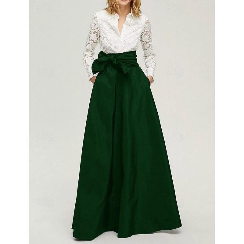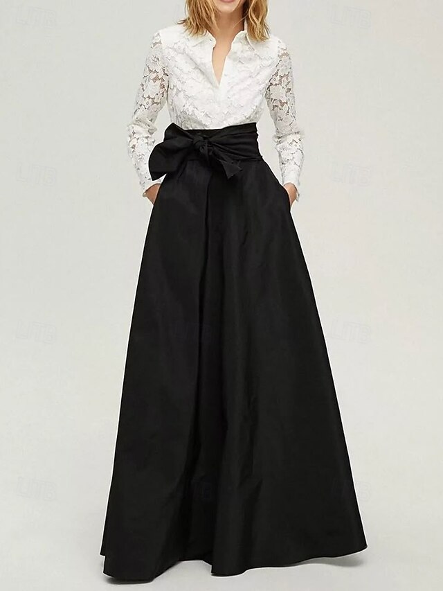 Why Choose Black and White Formal Dress A-Line Mother of the Bride Shirt Dress Elegant elementary Minimalist Shirt Collar Floor Length Stretch Lace Tafetta Long Sleeve with Bow(s)?