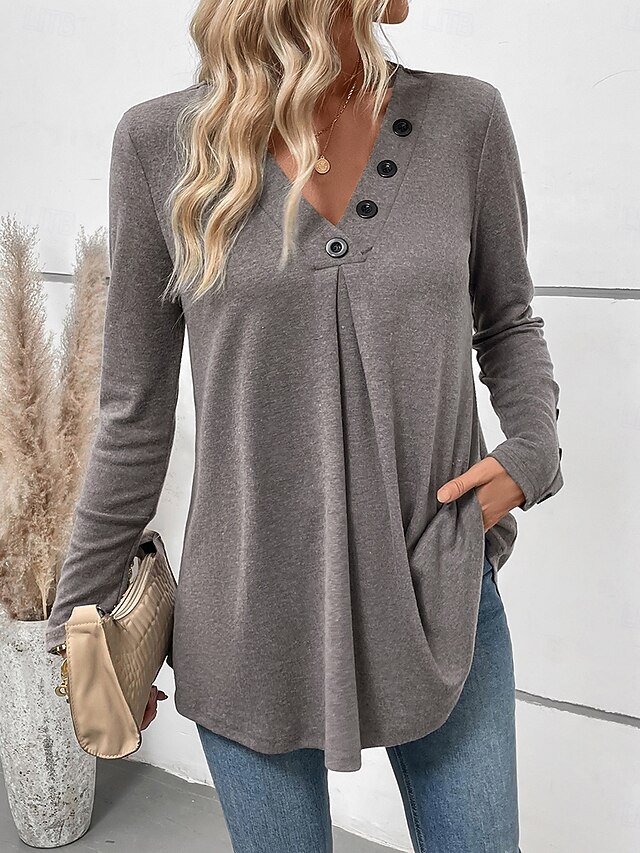 Women's Shirt Solid Color Casual Long Sleeve V Neck Regular Tops Daily Buttons Gray Fall Winter