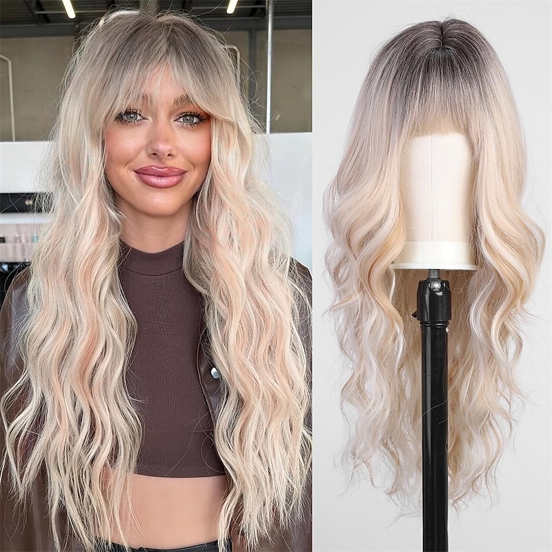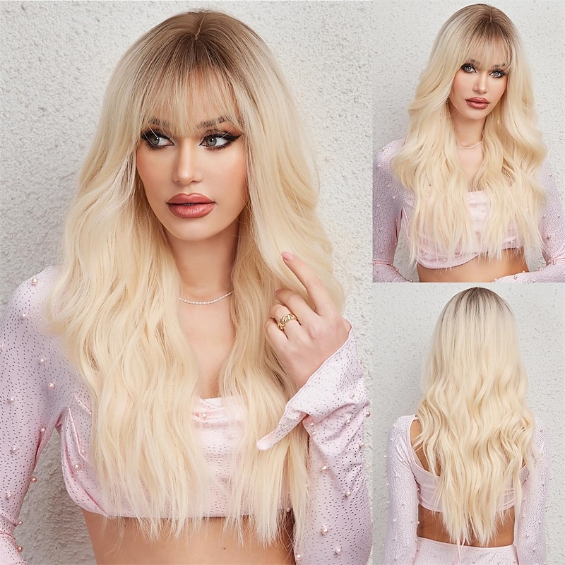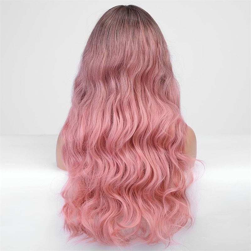 Long Pink Wavy Wig for Women Ombre Pink Wig Dark Root 26 Inch with Bangs Curly Wavy Wig Natural Looking Synthetic Heat Resistant Fiber Wig for Daily Party Use
