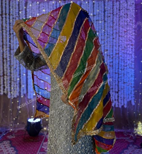 - Vibrant Colors: This multicolored dupatta features a stunning rainbow hue, adding a pop of color to any bridal or ethnic ensemble.