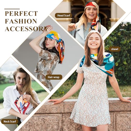 Comfort Feel : Crafted from polyester fabric, these silk scarf for women hair offer a luxurious silk-like feel that is both breathable and skin-friendly. The smooth texture and softness make them comfortable to wear all day long.Versatile and Multi-Functional: These 35x35 inch large satin scarf are incredibly versatile and can be used in multiple ways. Wear them as a neck scarf, head scarf, hair scarf, shawl, hair band, chic tie, handbag accessory, hat decoration, wristband, or even as a belt. The generous size also allows you to use it as a top, making it a must-have for your wardrobe.chic Vintage Print Patterns: Each head scarves for women features special vintage print patterns that add a touch of elegance and style to any outfit. Whether you're dressing up for a party, wedding, or just adding a of color to your daily look, these headscarf for women's hair are ideal for any occasion. They are also an ideal gift choice for Valentine's Day, Christmas, Mother's Day, Graduation, and more.Fit for Most Head Types: One size fits most, ensuring that these large square satin head scarves will fit different head types. The lightweight and fashion design mean they stay in place all day without riding up or slipping off, providing a comfortable and hassle-free experience.Value Pack with 4 Pieces: This set includes 4 pieces of high-quality head wraps for women, offering ample quantity for various clothing and hairstyle matches. Add more charm and elegance to your daily outfits and create different looks effortlessly. With these satin hair scarves, your outfit will be more gorgeous and stylish every day. Perfect for everyday use. premium materials and excellent craftsmanship ensure long-lasting durability.