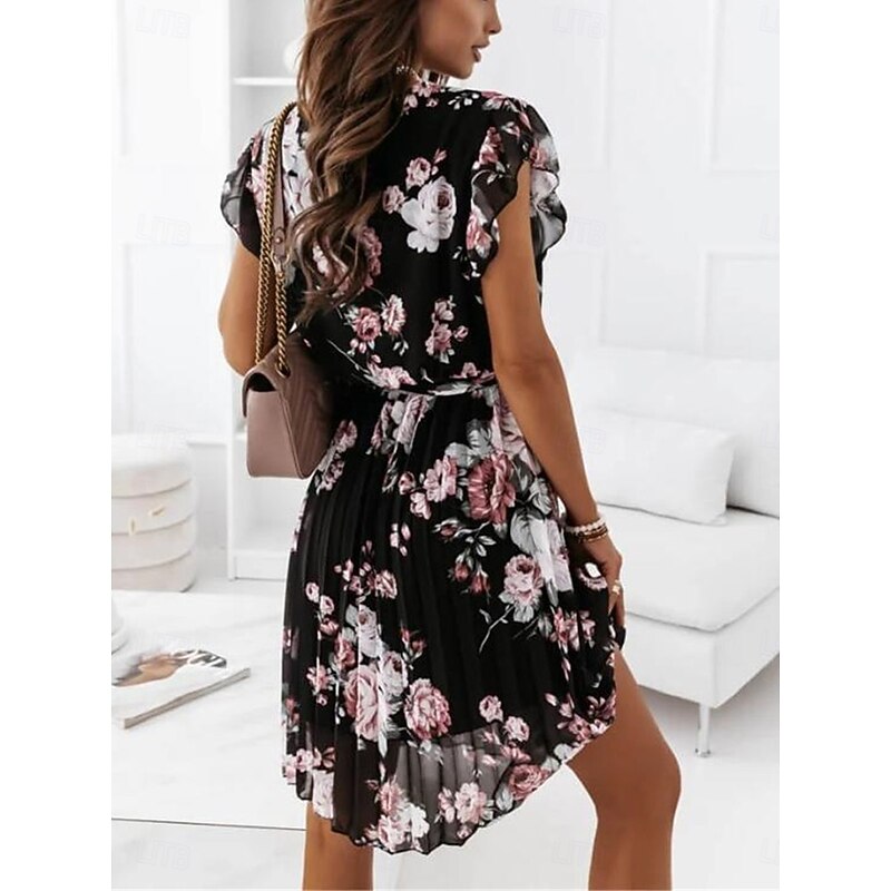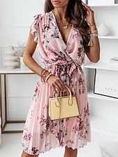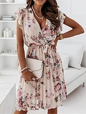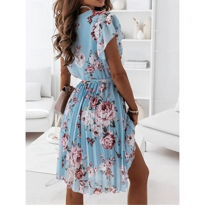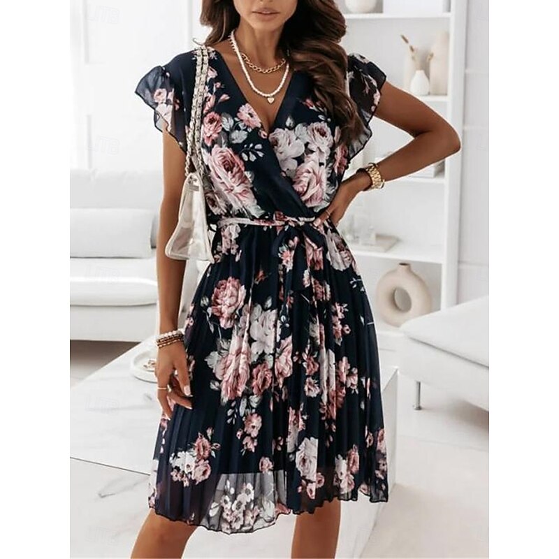 Highlights [Fabric] : This women's dress is crafted from lightweight, breathable polyester, offering a comfortable and micro-elastic fit perfect for summer days and evenings. The fabric's flowy nature enhances the dress's elegance and lends a relaxed yet fashionable vibe. [Silhouette] : Featuring an A-line silhouette, this casual dress is designed with a regular fit that flatters different body types. The cinched waist creates a tailored look, providing a graceful and feminine outline that enhances your natural shape. [Design Highlights] : The dress showcases a charming floral print in a dreamy palette, adding a vintage-inspired aesthetic to your wardrobe. Its deep V-neckline infuses a hint of allure, while the short flutter sleeves evoke a whimsical and feminine feel. The pleated skirt ensures graceful movement with every step. [Occasions] : This versatile dress is perfect for a range of occasions, from casual daily outings to romantic dates and vacations. Its stylish yet casual design makes it suitable for various summer events, ensuring you look effortlessly chic in any setting. [Size Range] : Available in a wide range of sizes from S to 2XL, this dress caters to different body types, ensuring a perfect fit for everyone. Whether you prefer a snug fit or a more relaxed look, you'll find the right size for your comfort and style. Perfect for everyday use. first-class materials and excellent craftsmanship ensure long-lasting durability.