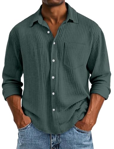 trending ! Mokaloha Mens Long Sleeve Shirts, Men's Casual Solid Color Breathable Cotton Pleated Lapel Long-Sleeved Shirt