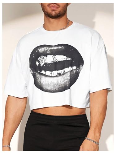GORGLITTER Men's Graphic Tees Cropped Shirt Tops Short Sleeve Rhinestone Lips Crewneck Tee