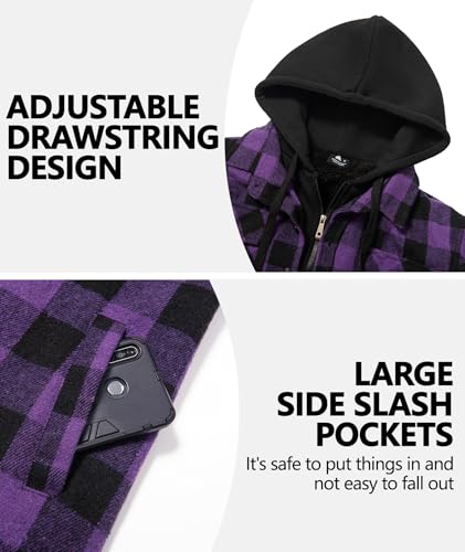 Fabric type: 80% Polyester,20% CottonCare instructions: Machine WashOrigin: ImportedMATERIAL:This men's flannel jacket is made of high-quality fabric, the shell is thickened polyester and the lining is soft and skin-friendly lambswool for superior warmthWARM & WINDPROOF: This winter coat for men is designed with a full zipper, which not only makes it easy to put on and take off, but also keeps the cold wind from blowing into your body. The design with an adjustable drawstring keeps the fleece hood close to your head to keep you warmDESIGN FEATURES: This jacket includes 2 chest pockets and 2 side pockets. The chest pocket can hold small items such as key chains and bank cards, while the side pockets are convenient for accessing your cell phone. The traditional plaid design fits perfectly with a variety of undergarments such as t-shirts, sweaters, hoodies and moreEASY CARE: The fabric of this plaid jacket has been proven to be not easy to lose color and not deformed after repeated washing. Daily maintenance is also very simple, just normal machine washing and dryingOCCASIONS: This men's plaid fleece hoodie is perfect for casual or active wear, work, home, daily warmth, vacation, school, outdoor recreation, hiking, camping, hunting, fishing and other outdoor activities. Great for fall and winter wear Perfect for everyday use. premium materials and excellent craftsmanship ensure long-lasting durability.