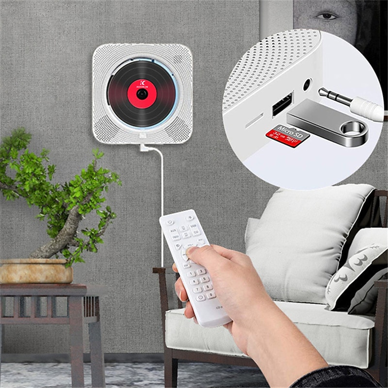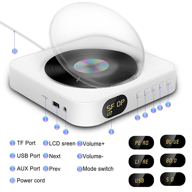 Highlights - A versatile CD player with five functions: portable CD player, FM radio, Bluetooth HiFi speaker, Mini Home Boombox, and USB drive player, making it an ideal gift for music enjoyment, language learning, birth preparation, early education, and more. - Bluetooth 5.1 technology allows for faster transmission speed, stable performance, and high anti-jamming capability, providing high-quality wireless audio from Bluetooth-enabled devices such as mobile phones, iPads, or computers. - Comes with wall mounting set and stand for easy mounting on the wall or standing on the desk/table, allowing for flexible use anytime and anywhere. - Equipped with dust protection and an LED screen display that shows different modes (CD playback, USB playback, Bluetooth, FM radio, AUX mode), volume, track, and song information. - Wide compatibility includes support for CD/CD-R/CD-RW/MP3/WMA and all kinds of CDs, built-in Bluetooth for connecting Bluetooth-enabled devices, aux-in/out and 3.5 mm audio input jack for all audible devices, remote control support for a distance of 5 meters, and a USB port for USB flash. outstanding for everyday use. premium materials and excellent craftsmanship ensure long-lasting durability.