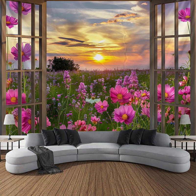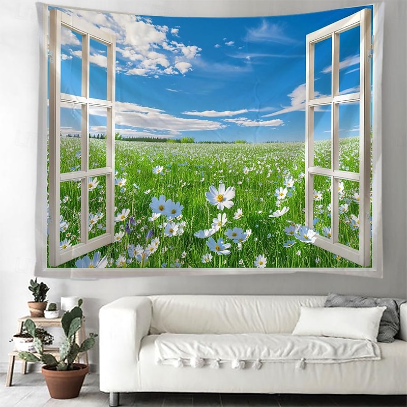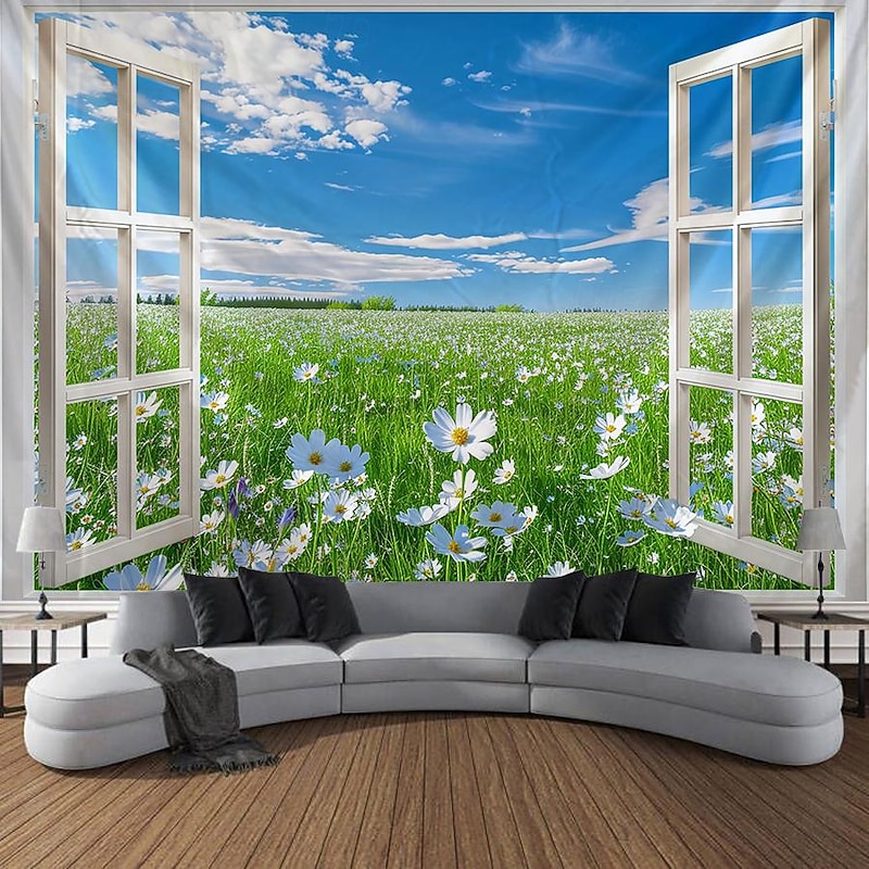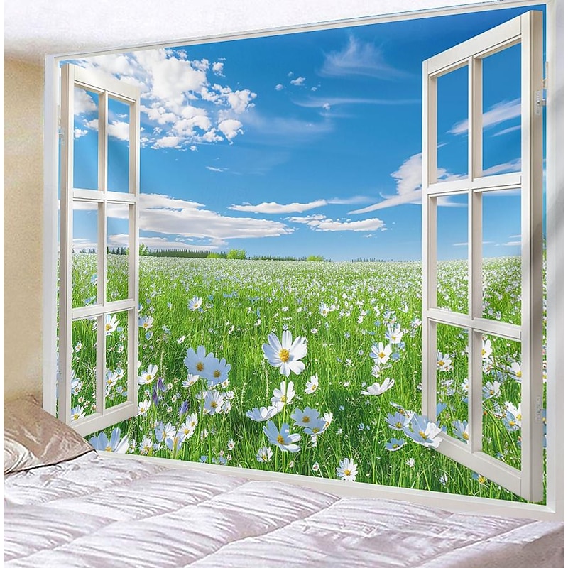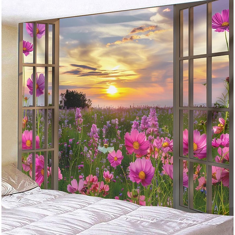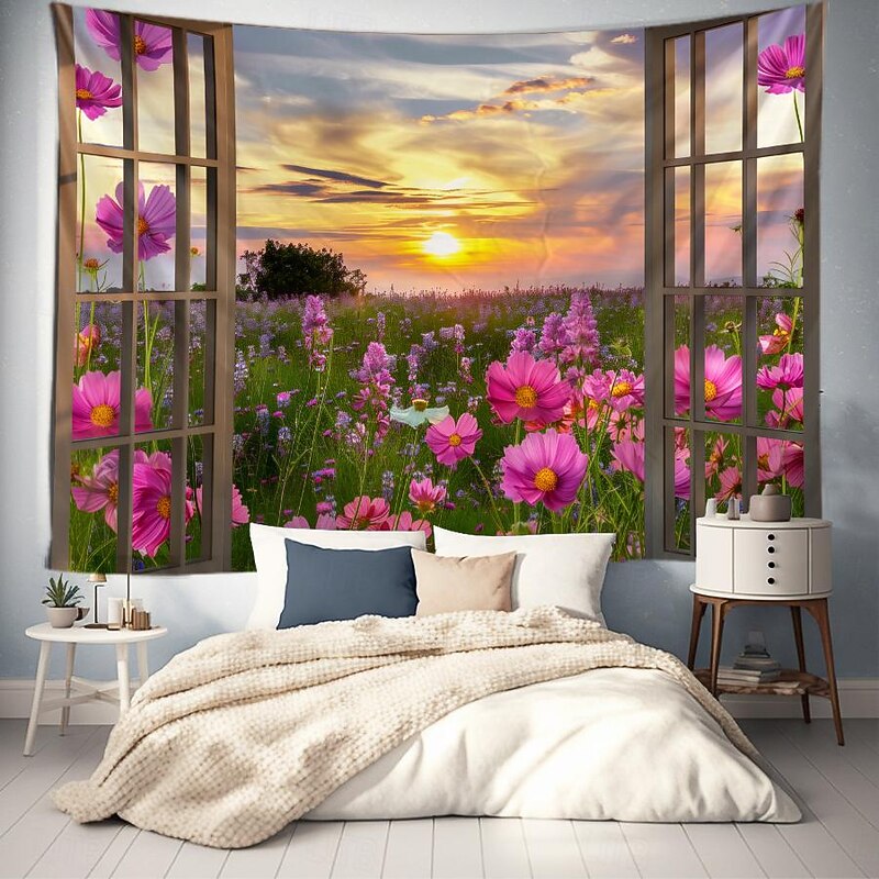 Window Flowers Field Hanging Tapestry Wall Art Large Tapestry Mural Decor Photograph Backdrop Blanket Curtain Home Bedroom Living Room Decoration