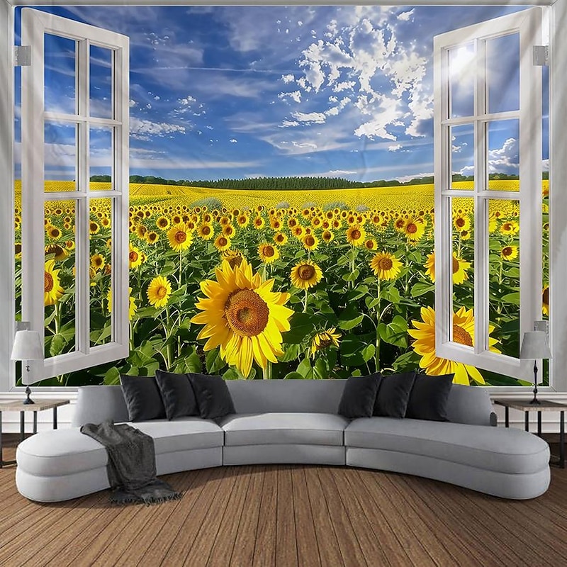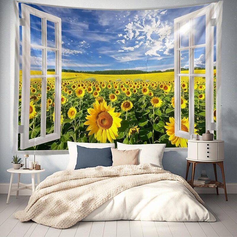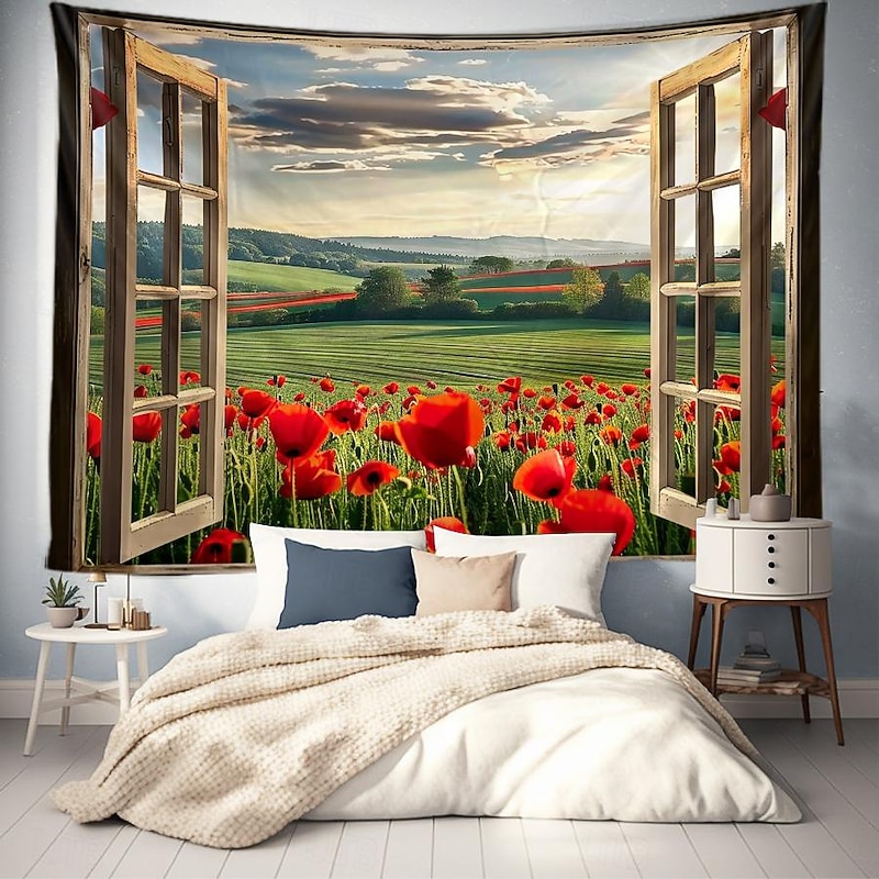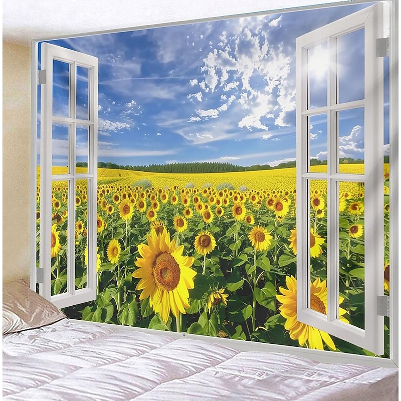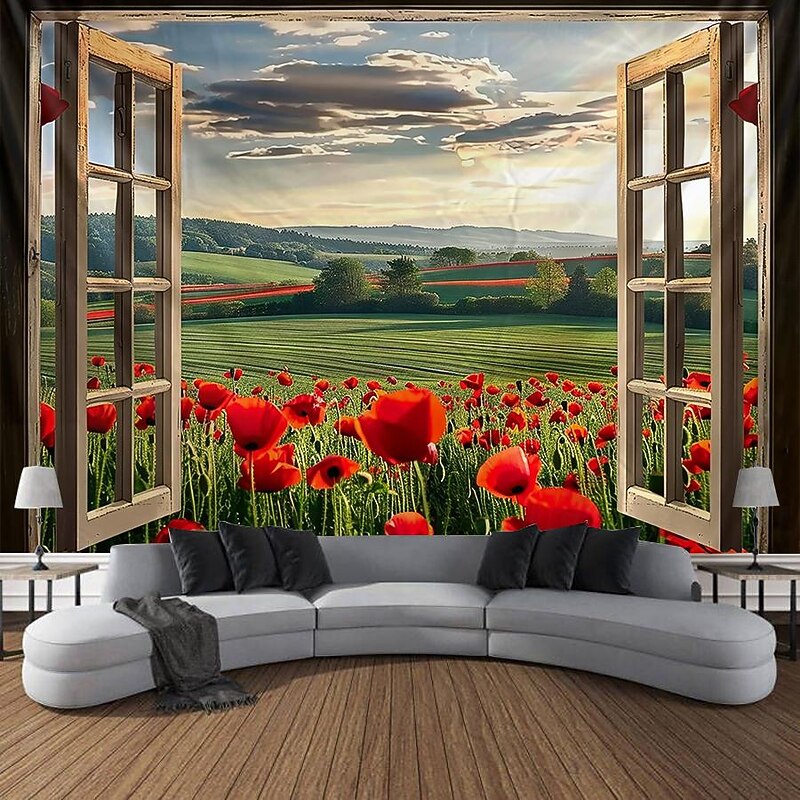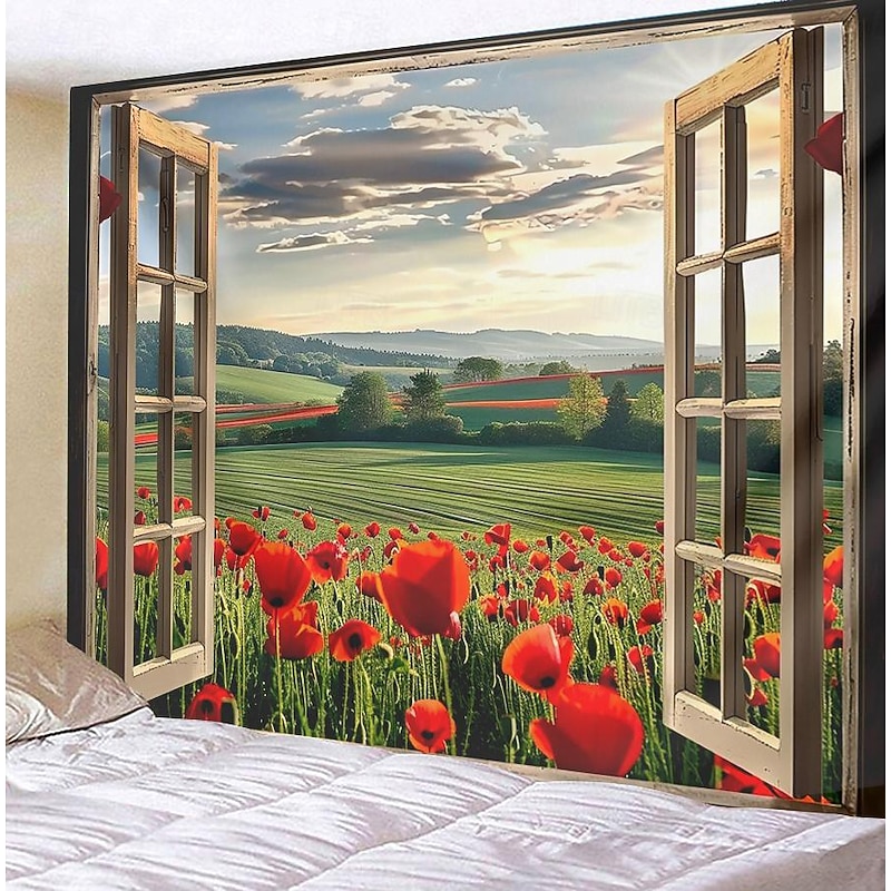 Window Flowers Field Hanging Tapestry Wall Art Large Tapestry Mural Decor Photograph Backdrop Blanket Curtain Home Bedroom Living Room Decoration