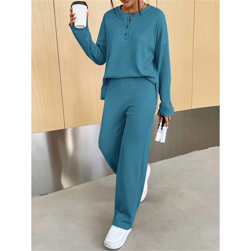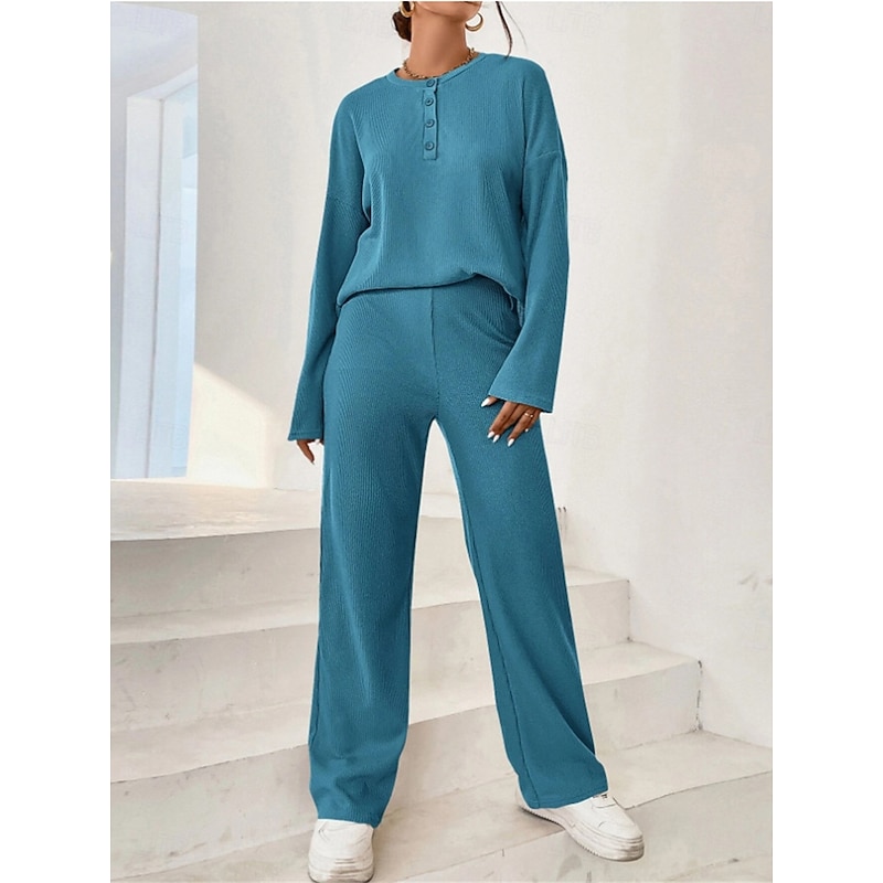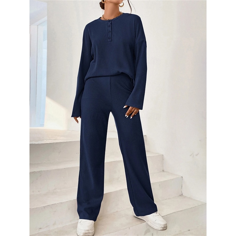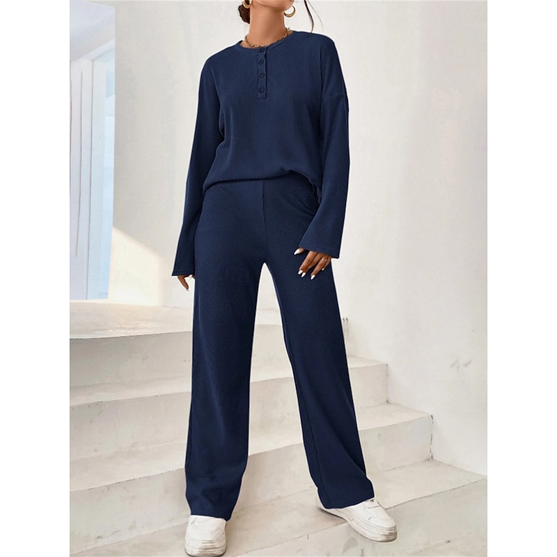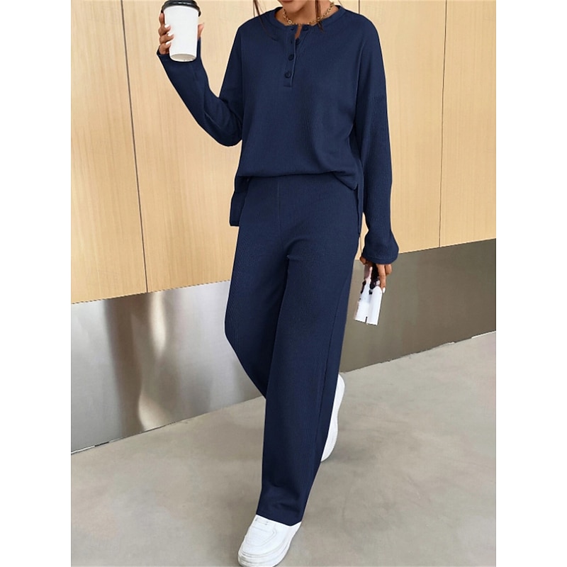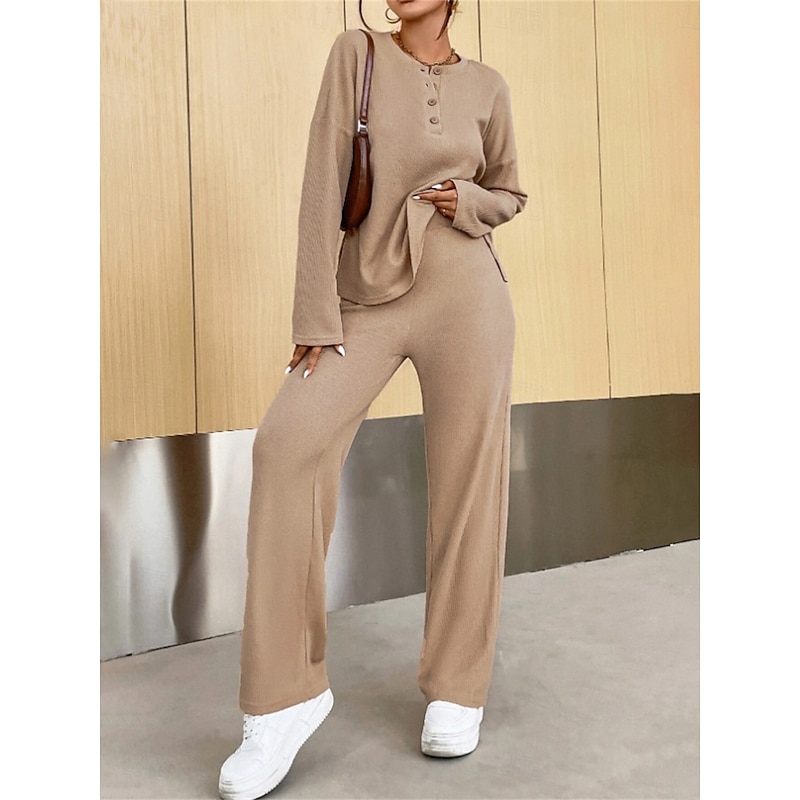 Highlights [Fabric] : Crafted from high-quality polyester, this womenβs sweatshirt offers a micro-elastic fit that ensures comfort and flexibility. Its soft, ribbed texture makes it a cozy choice for the colder months of fall and winter. [Fit] : The set includes a long-sleeve sweatshirt with a regular fit, providing a relaxed yet fashionable silhouette. The pants are designed with a wide-leg cut, enhancing ease of movement while maintaining a chic and contemporary look. [Design Highlights] : Featuring a classic crew neck and a plain, unembellished pattern, this set delivers a clean and modern aesthetic. The button-down neckline of the top adds a touch of sophistication, while the neutral beige color complements a variety of accessories, offering endless styling options. [Occasions] : Perfect for daily wear and casual outings, this set is ideal for lounging at home or stepping out for errands. It effortlessly balances fashion and comfort, making it a versatile addition to any wardrobe. [Size Notice] : Available in a range of sizes from S to XL, this sweatshirt set caters to different body types, ensuring a comfortable and flattering fit for everyone. Perfect for everyday use. first-class materials and excellent craftsmanship ensure long-lasting durability.