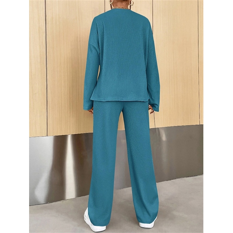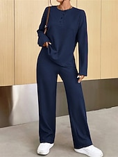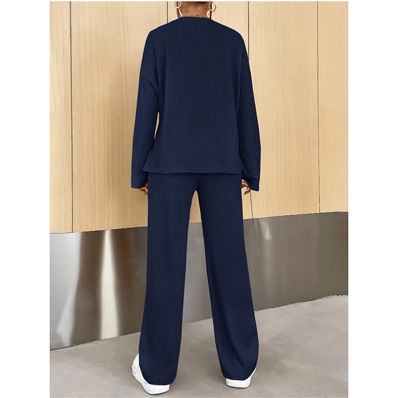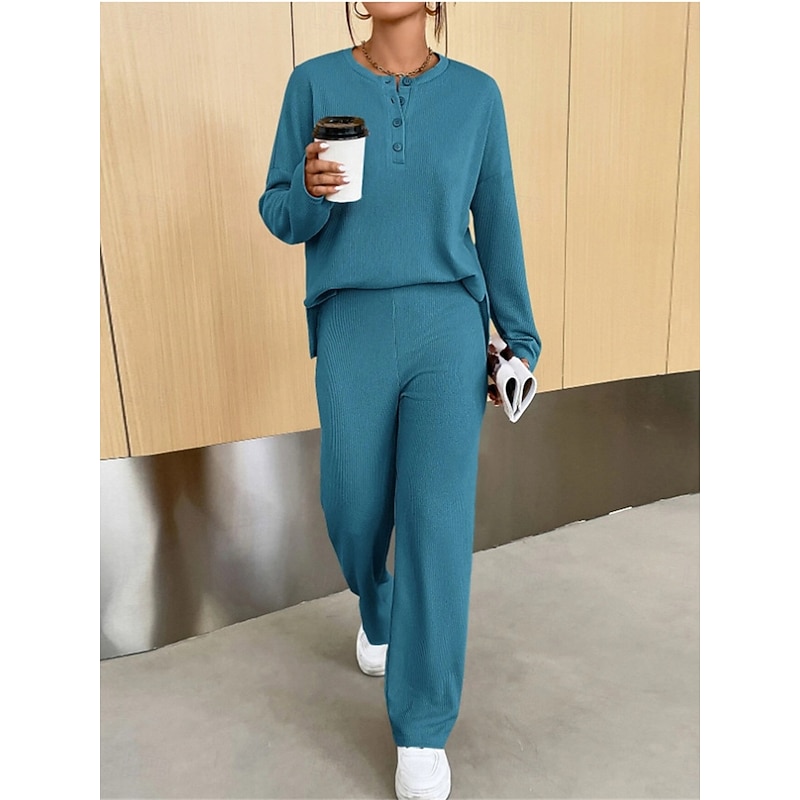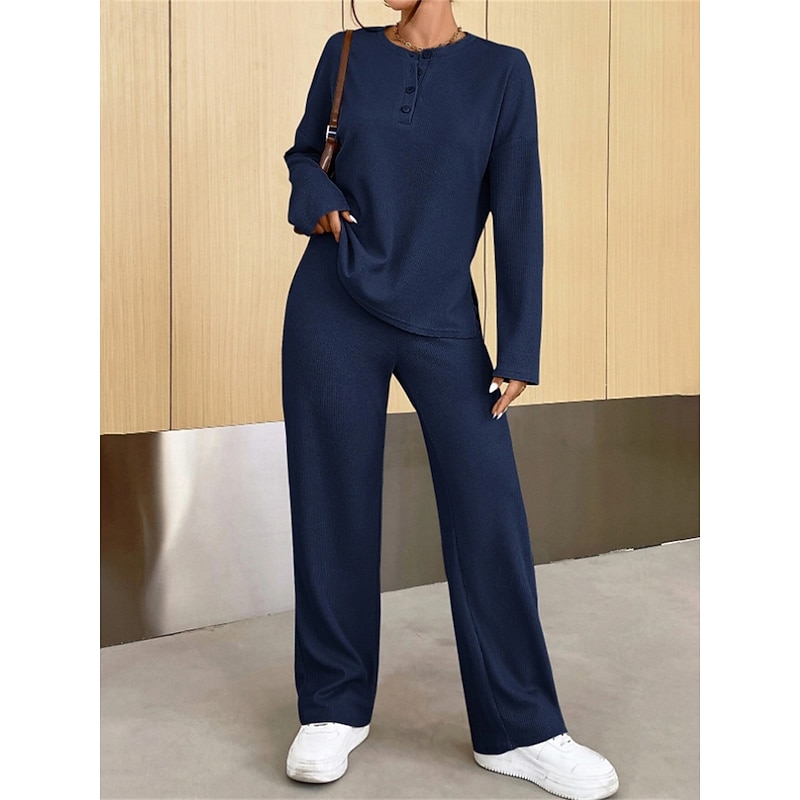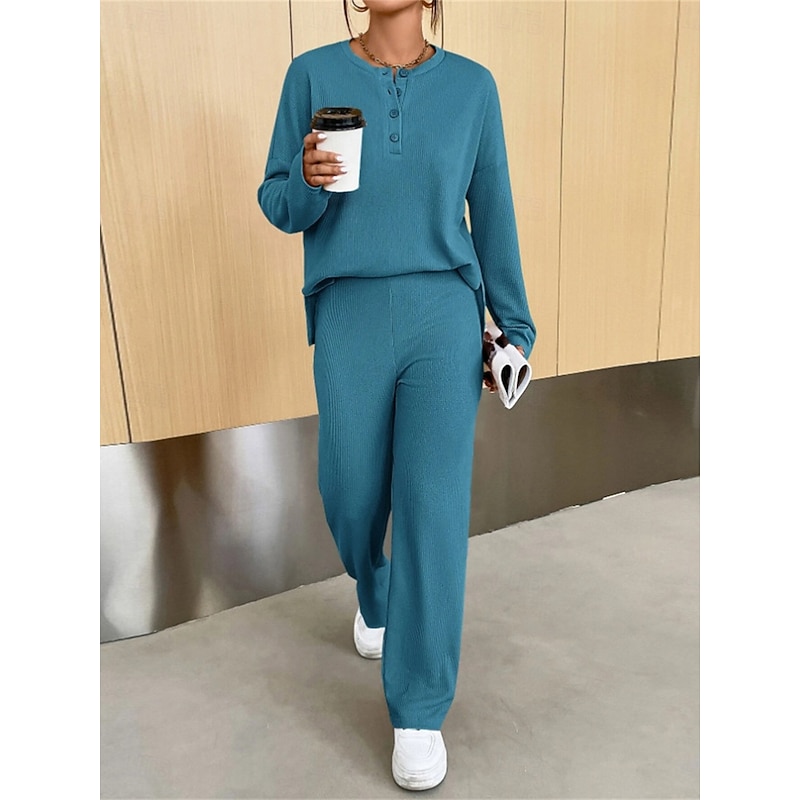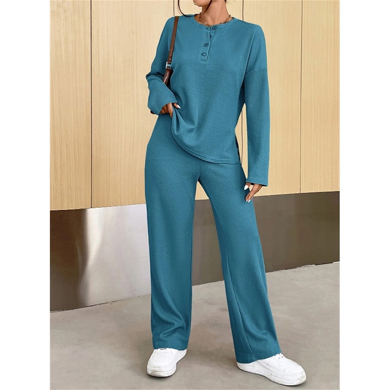 Highlights [Fabric] : Crafted from high-quality polyester, this womenβs sweatshirt offers a micro-elastic fit that ensures comfort and flexibility. Its soft, ribbed texture makes it a cozy choice for the colder months of fall and winter. [Fit] : The set includes a long-sleeve sweatshirt with a regular fit, providing a relaxed yet fashionable silhouette. The pants are designed with a wide-leg cut, enhancing ease of movement while maintaining a chic and contemporary look. [Design Highlights] : Featuring a classic crew neck and a plain, unembellished pattern, this set delivers a clean and modern aesthetic. The button-down neckline of the top adds a touch of sophistication, while the neutral beige color complements a variety of accessories, offering endless styling options. [Occasions] : Perfect for daily wear and casual outings, this set is ideal for lounging at home or stepping out for errands. It effortlessly balances fashion and comfort, making it a versatile addition to any wardrobe. [Size Notice] : Available in a range of sizes from S to XL, this sweatshirt set caters to different body types, ensuring a comfortable and flattering fit for everyone. Perfect for everyday use. first-class materials and excellent craftsmanship ensure long-lasting durability.