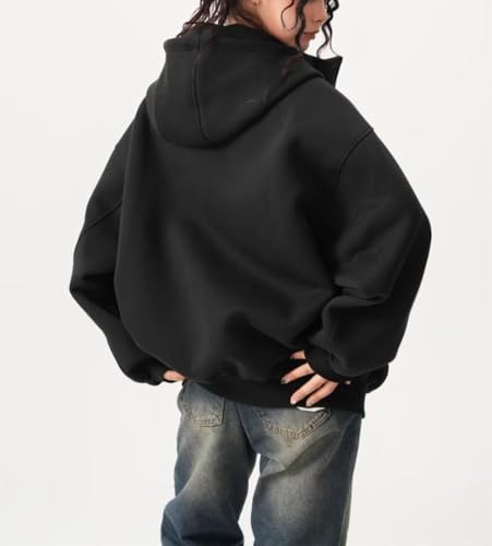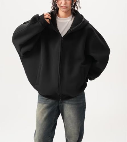 Mens Zip Up Hoodie Oversized Sweatshirt for Women Heavyweight Couple Hooded Sweatshirt With Pockets (US, Alpha, Large, Regular, Long, BLACK)