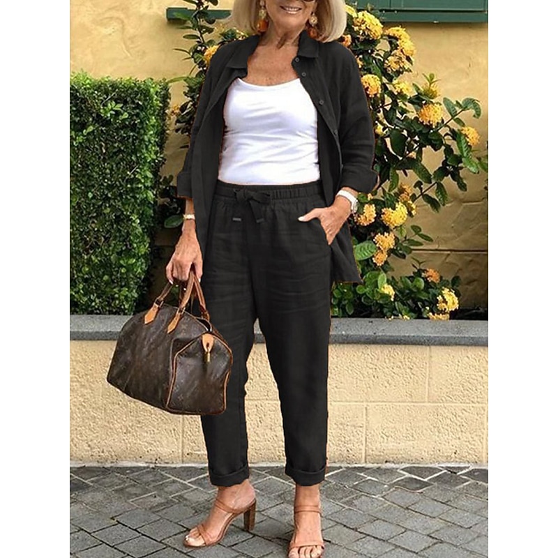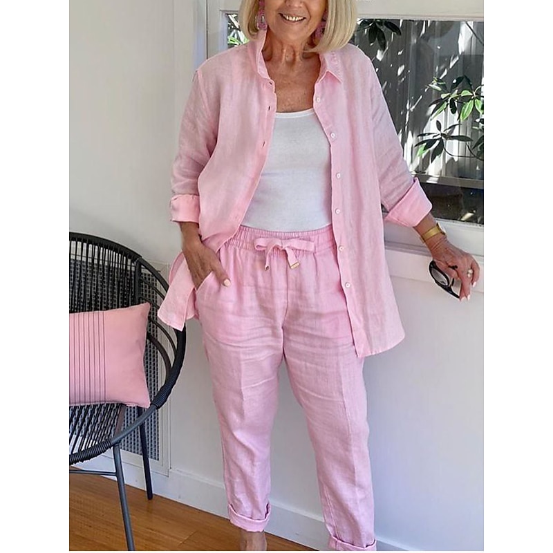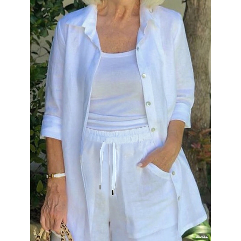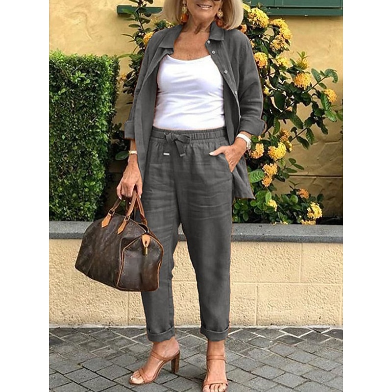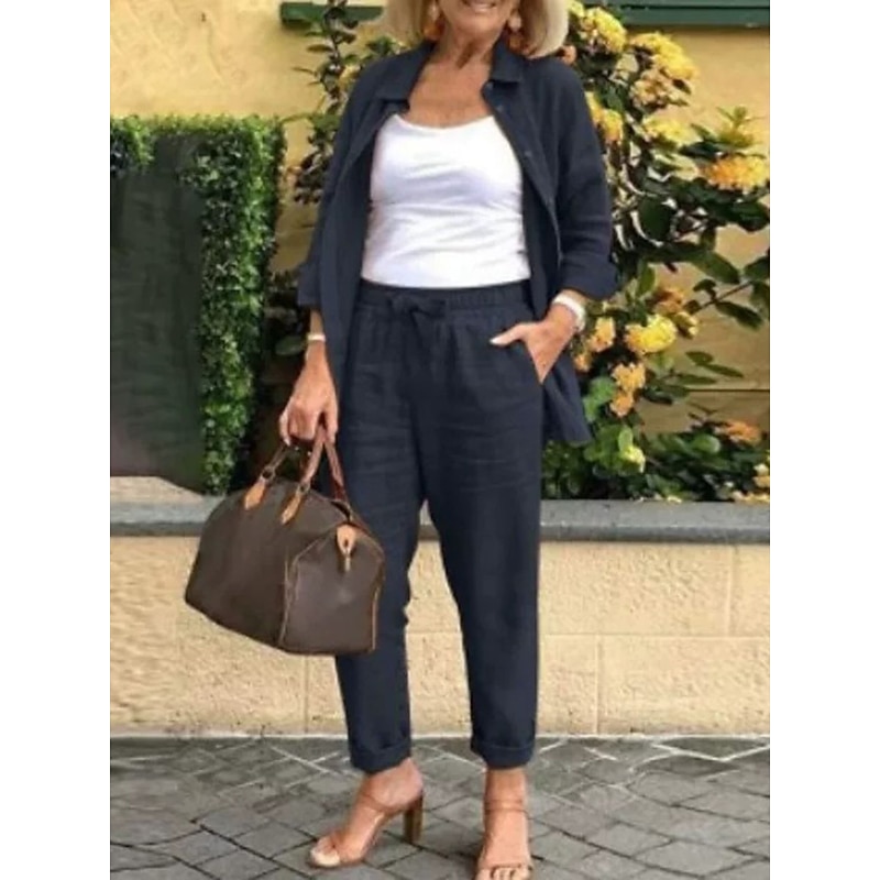 Highlights [Fabric:] Crafted from a breathable blend of linen and polyester, this loungewear set offers a soft, airy feel with micro-elastic properties, ensuring both comfort and style throughout the warmer seasons. [Fit:] The outfit boasts a casual and comfortable fit, featuring a relaxed jacket and pants combination. The jacket's classic button-down design alongside the pants' elastic waistband with drawstring ensures the perfect balance of laid-back style and practicality. [Design Highlights:] The light beige jacket includes long sleeves and a versatile cut that allows for effortless layering. The pants are thoughtfully designed with side pockets for added convenience, while paired nude strappy heels and a brown leather handbag supplement the ensemble with elegance and functionality. [Occasions:] Ideal for casual outings, daily wear, vacations, or enjoying time at home, this ensemble presents a chic yet laid-back vibe that effortlessly transitions from home to a chic day out. [Size:] Available in a range of sizes from S to 5XL, accommodating a variety of body types and preferences. Perfect for everyday use. premium materials and excellent craftsmanship ensure long-lasting durability.