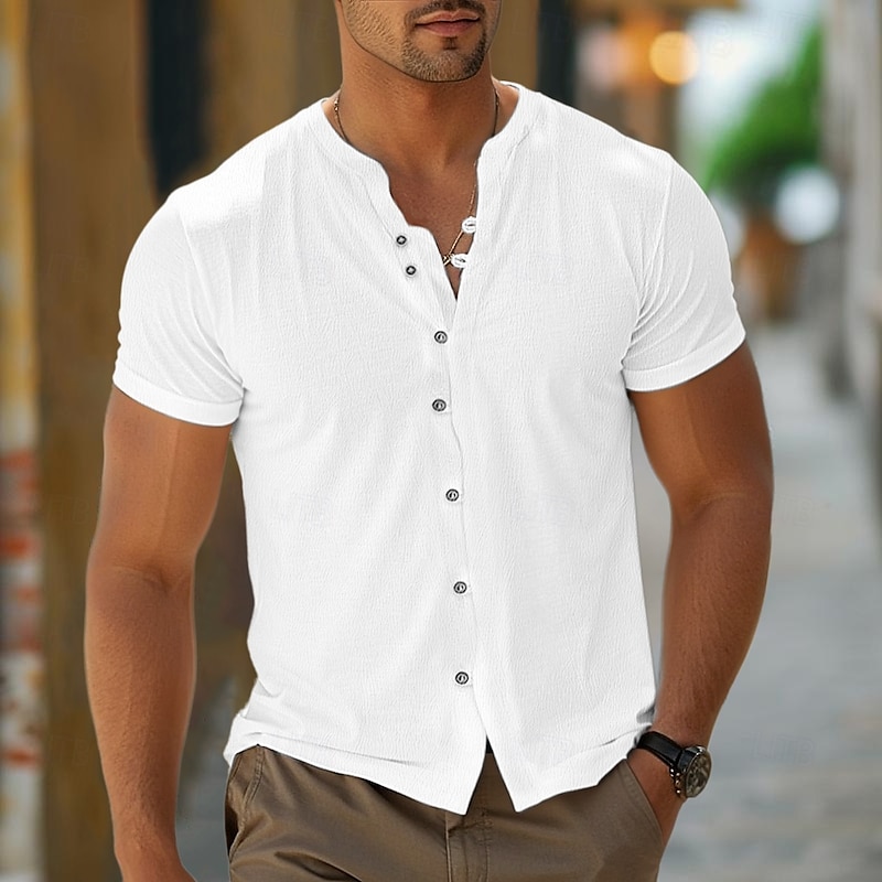 Highlights [Fabric] : Crafted from a blend of cotton and linen, this men's shirt offers a soft, breathable, and lightweight feel. The fabric ensures maximum comfort and is perfect for keeping cool during the warmer summer months. [Fit] : The shirt features a regular fit that sits comfortably on the body, enhancing the wearer's natural silhouette without being too tight or too loose. Its design is tailored to provide a relaxed yet polished appearance suitable for various occasions. [Design Highlights] : This short-sleeve shirt boasts a classic band collar with a buttoned placket for an adjustable neckline, offering a touch of understated elegance. The plain pattern and sleek finish provide a modern and versatile look, making it easy to mix and match with different outfits. [Occasions] : Versatile in style, this shirt is ideal for vacations, holidays, casual daily wear, beach outings, and street events. Its casual yet chic design makes it a must-have for any summer wardrobe, perfect for pairing with jeans or chinos. [Size Range] : Available in a wide range of sizes from S to 3XL, this shirt caters to various body types, ensuring a comfortable and flattering fit for everyone. Perfect for everyday use. premium materials and excellent craftsmanship ensure long-lasting durability.