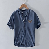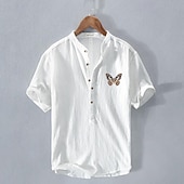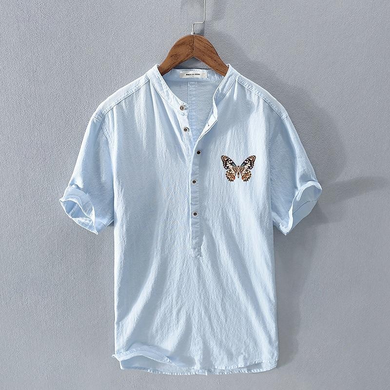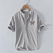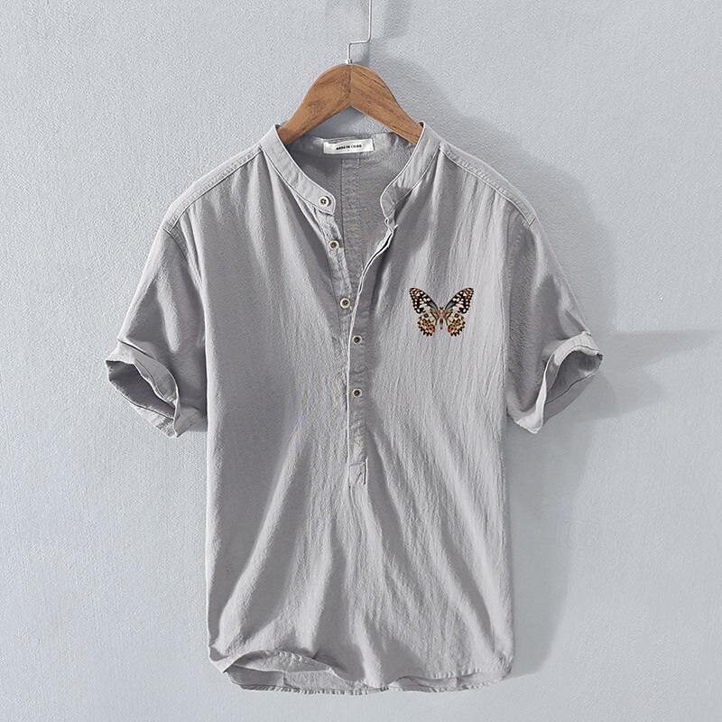 Highlights [Fabric] : Crafted from a breathable and lightweight cotton linen blend, this men's shirt is perfect for staying cool and comfortable during the summer months. The fabric ensures a soft feel against the skin, making it ideal for daily wear. [Fit] : Designed with a relaxed fit, this shirt provides ease of movement and all-day comfort. The short sleeves and half-placket button front add to its casual appeal, making it suitable for diverse styling options. [Design Highlights] : Featuring a modern band collar, this shirt offers a contemporary twist on a classic style. A standout feature is the embroidered butterfly on the left chest, which adds a unique and playful touch to the overall look. [Occasions] : This versatile shirt is perfect for various occasions, including vacations, holidays, casual outings, and streetwear. Its chic yet comfortable design makes it a great addition to a summer wardrobe, suitable for leisurely activities. [Size Range] : Available in a variety of sizes from S to 2XL, catering to different body types and preferences. The shirt comes in multiple colors, including White, Navy Blue, Gray, and Light Blue, allowing for personalized style choices. Perfect for everyday use. premium materials and excellent craftsmanship ensure long-lasting durability.