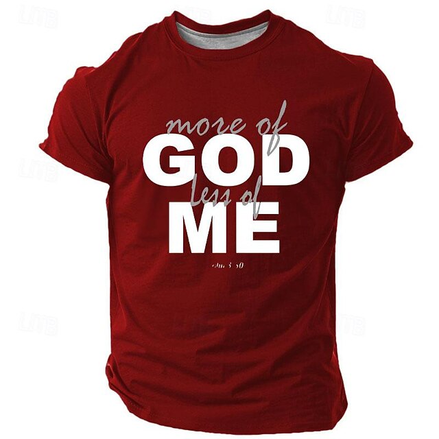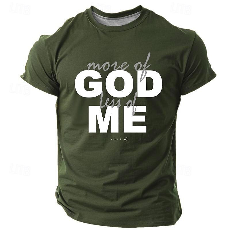 The t-shirt showcases a bold and impactful graphic print with the phrase "more of GOD less of ME," adding a meaningful statement to its retro vintage appeal. The vibrant 3D print and versatile color options, including Black, Red, Navy Blue, and Army Green, make it a standout piece in any wardrobe.