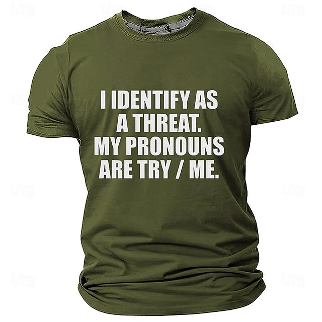 Highlights [Fabric] : Crafted from a stretchy and breathable polyester fabric, this Men's T-shirt ensures comfort and durability for everyday wear. Perfect for spring and summer seasons, it provides a supple touch and relaxed feel throughout the day. [Fit & Style] : Featuring a tailored fit and timeless crew neck design, this T-shirt is ideal for casual and retro vintage styles. The short sleeves offer a versatile and easygoing look, making it suitable for various occasions. [Design Highlights] : The standout feature of this T-shirt is its bold and humorous front print, stating "I IDENTIFY AS A THREAT. MY PRONOUNS ARE TRY / ME." The 3D print adds a dynamic edge, and the olive green color enhances its trendy and bold appearance. [Occasions] : Perfect for street, casual outings, and bar settings, this T-shirt is designed for adults seeking to showcase their personality and make a statement. Whether you're hitting the town or relaxing with friends, it complements a variety of casual looks. [Size Range] : Available in multiple sizes from S to 3XL, this T-shirt accommodates a wide range of body types, ensuring a tailored fit for every individual.