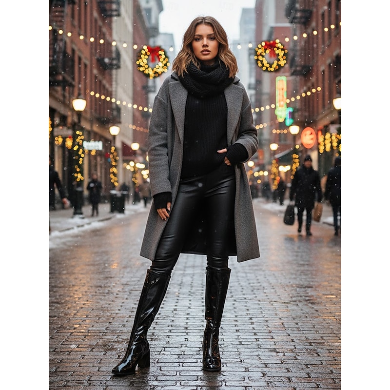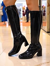 trending ! Women's Black Patent Faux Leather Knee-High Block Heel Fashion Boots, Shiny Zip-Up Go-Go Boots for Parties, Fashion Shows and Night Out Outfits