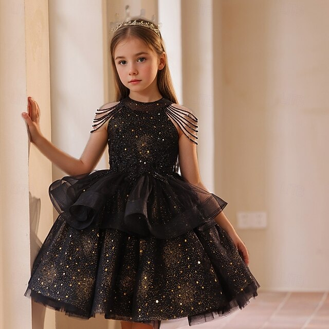 Highlights [Fabric] Crafted from luxurious sequined fabric, this dress features a stunning play of light and texture, making it an eye-catching piece for any event. The use of tiered plisse adds depth and movement to the design, enhancing its elegance. [Fit] The dress boasts a princess silhouette with a knee-length hemline that is both classic and charming. The halter neckline and sleeveless design allow for ease of movement while maintaining a graceful appearance. [Design Highlights] This dress is adorned with solid color embellishments and intricate beadwork, highlighted by the shimmering gold accents that add a regal touch. The layered skirt, crafted from tulle, cascades beautifully, adding drama and volume, while the delicate sheer cap sleeves enhance its ethereal allure. [Occasions] Ideal for pageants, performances, and other special occasions, this enchanting dress ensures your little princess stands out in style. Whether it's a formal event or a charming celebration, this dress adds a touch of grace and sophistication to any setting. [Size Range] Available in sizes 110 to 160, this dress accommodates girls of various ages and heights, ensuring a perfect fit for young fashionistas ready to shine. Perfect for everyday use. premium materials and excellent craftsmanship ensure long-lasting durability.