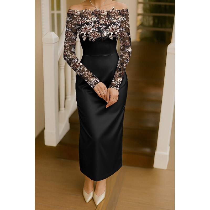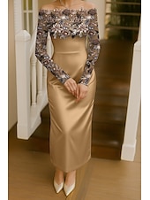 More information about Gold Floral Embroidered Lace Applique Sheath / Column Cocktail Dresses with Detachable Cape Elegant Dress Formal Wedding Tea Length Sleeveless Strapless Long Sleeve 2025