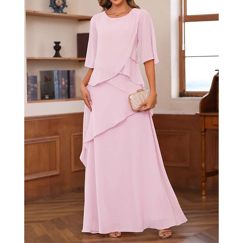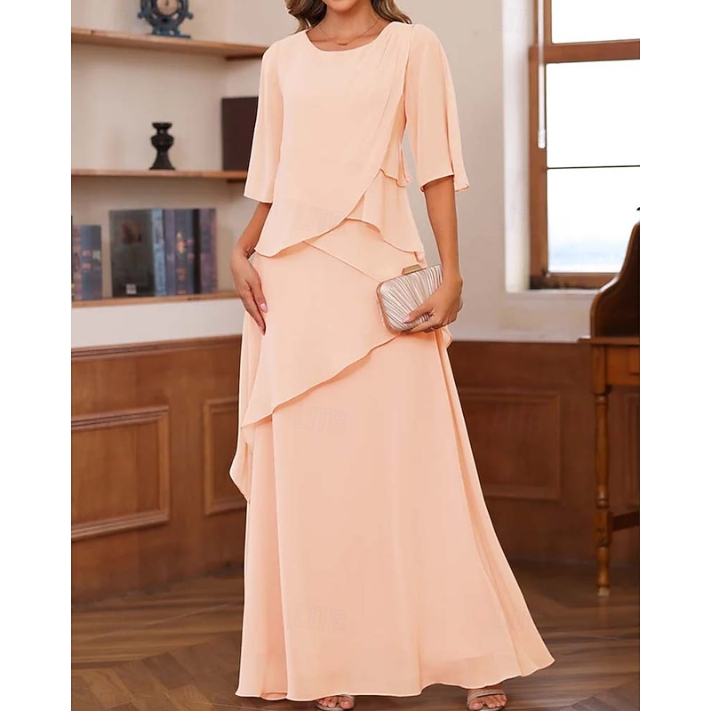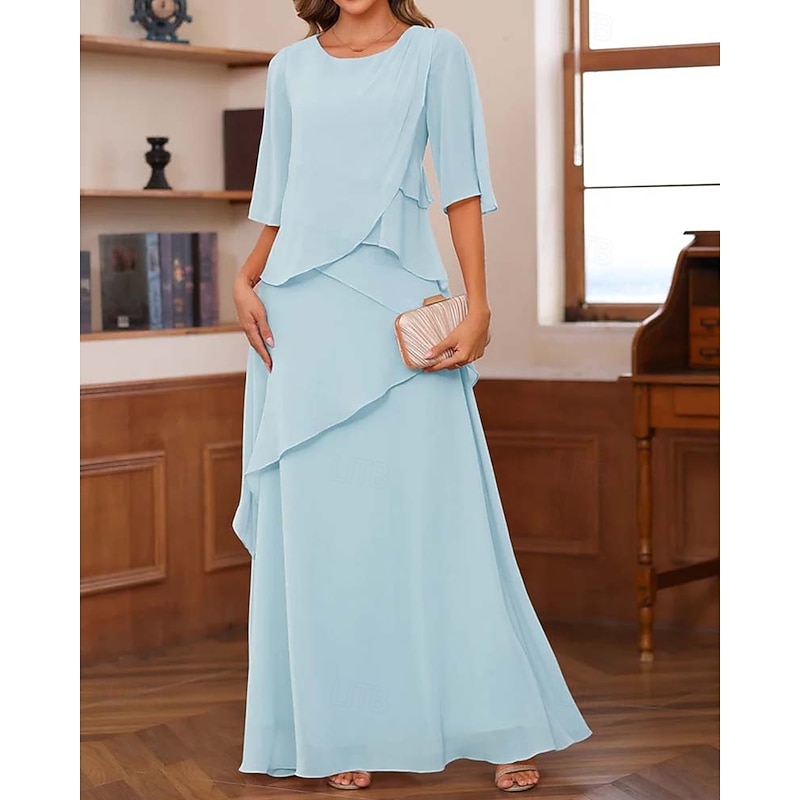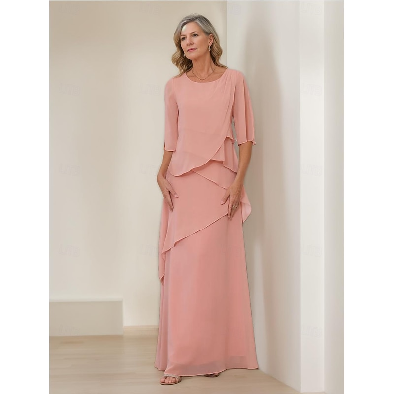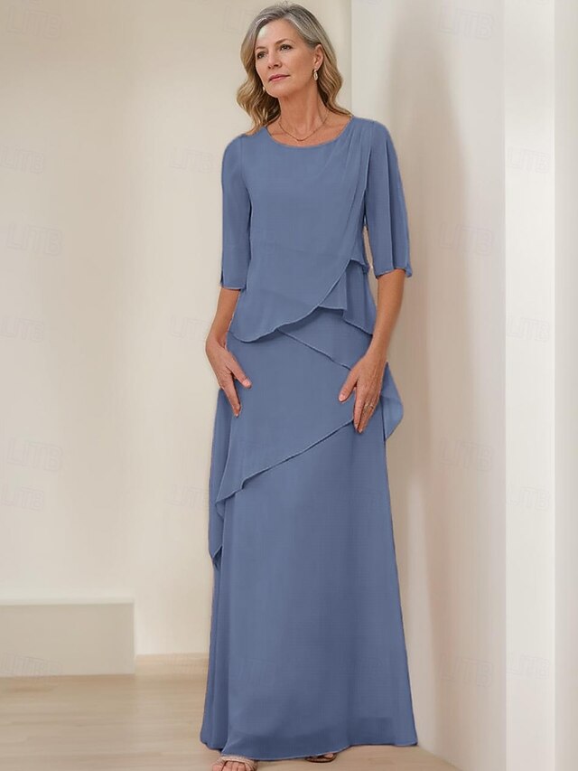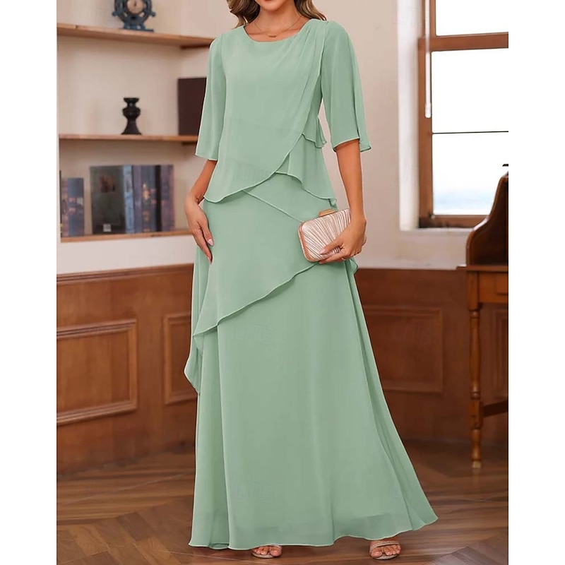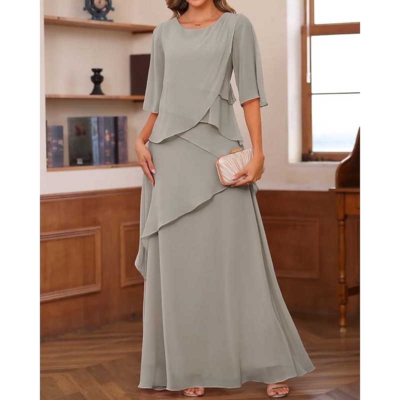 trending ! Sheath / Column Mother of the Bride Dress Formal Elegant Vintage basic Crew Neck Floor Length Chiffon Half Sleeve with Ruffles Cascading Ruffles