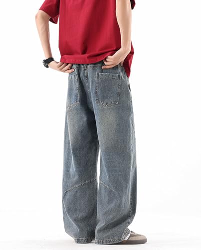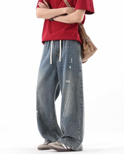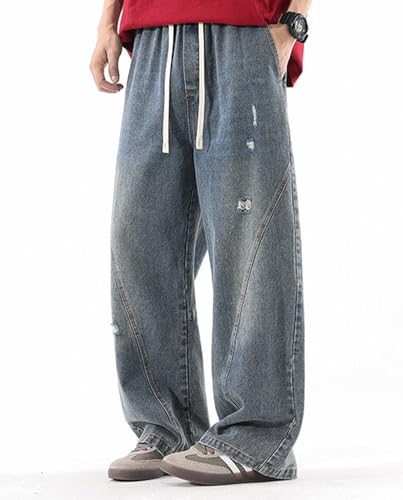 HBER Men's Elastic Waist Baggy Jeans Y2k Wide Leg Denim Pants with Drawstring Mid Rise Loose Fit Distressed Jeans