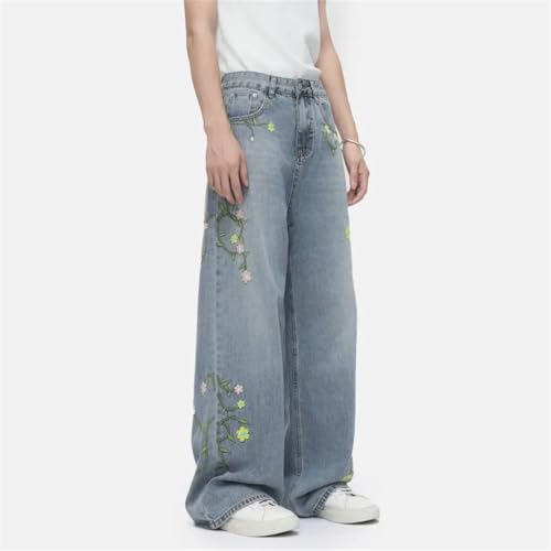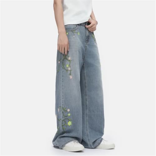 Men's Jeans Korean Style Flower Embroidery Contrast Color Loose Personalized Straight Denim Pants