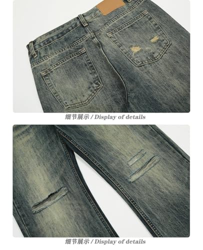 trending ! Jeans Pants Trousers Denim Street Trendy Retro Washed Blue Tear Hole Casual Commuter Straight Leg for Men