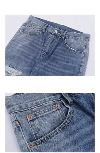More information about Men’S High Street Trendy Hole Worn Loose Fit Straight Denim Pants Button Fly Midweight Distressed Full Length Jeans