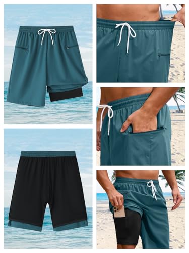 Fabric type: 100% PolyesterCare instructions: Machine WashOrigin: ImportedClosure type: DrawstringBreathable & Quick-Dry Fabric: Swimming trunks for men crafted from high-quality, lightweight material, these mens swim shorts are designed to dry quickly, ensuring you stay cozy and cool during all your summer adventures2 in 1 Shorts Men Swimsuit: Mens swim trunks with compression liner provide extra support and comfort, keeping you dry, comfortable and preventing from sticking to your skin even during intense physical activities or in humid conditions, mens bathing suit 9 inch inseam perfect for swimming, surfing, kayaking, drifting, fishing or casual summer wearSecure Zippered Pockets & Inner Lined Pocket: Mens board shorts equipped with two side zippered pocket for safekeeping valuables and an additional inner lined pocket which provide a secure way to carry essentials like keys, wallets, or phones, preventing them from falling out during activities like swimming or beach sportsElastic Waist Shorts with Adjustable Drawstring: Swimming shorts for men with elastic waistband and drawstring provide a customizable fit, making these quick dry fit long beach shorts ideal for all-day wear, whether you're lounging on the beach or enjoying water sportsBoard Shorts Men's Swimwear: Mens shorts 9 inch inseam offer a balanced length that provides coverage without restricting movement, ensuring comfort for various body types and solid color will never out of style. Casual black shorts men/ 2 in 1 mens khaki shorts/ grey dissolving swim trunks men/ Summer blue swim shorts men Perfect for everyday use. first-class materials and excellent craftsmanship ensure long-lasting durability.