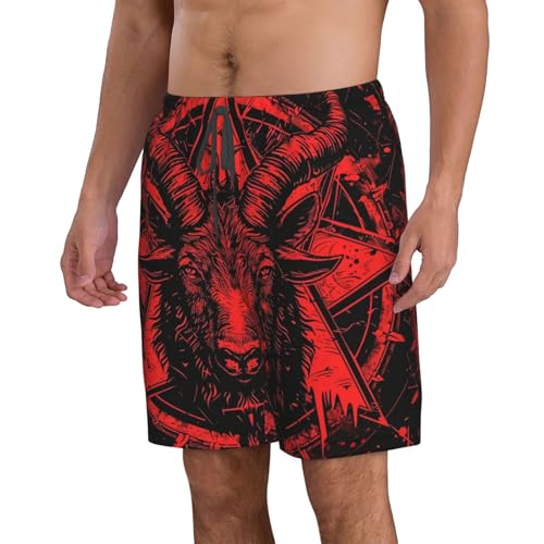 Baphomet Goat Satan Satanic Pentagram Red Black Men's rapid Dry Swim Shorts, Mesh Lined Beach Trunks with Pockets